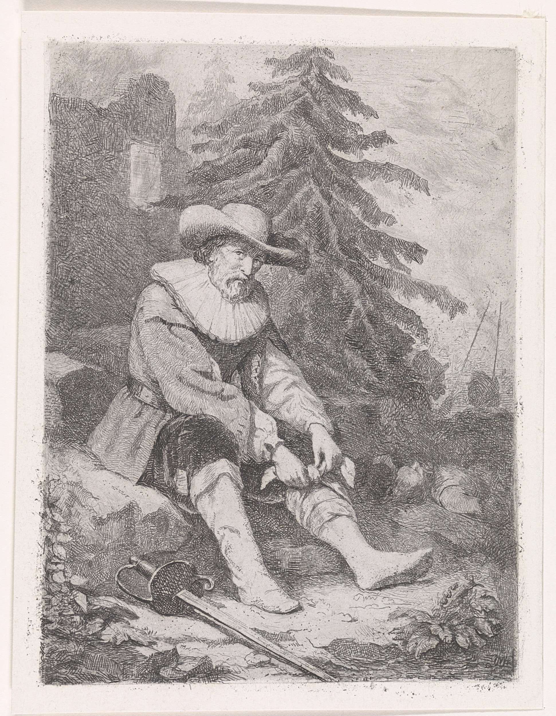 In een landschap verbindt een krijgsman zijn gewonde linkerbeen. Rechts naast hem ligt het levenloze lichaam van een soldaat, en links zijn rapier. Op de achtergrond zijn enkele naaldbomen en de contouren van een verwoeste gevel te zien.