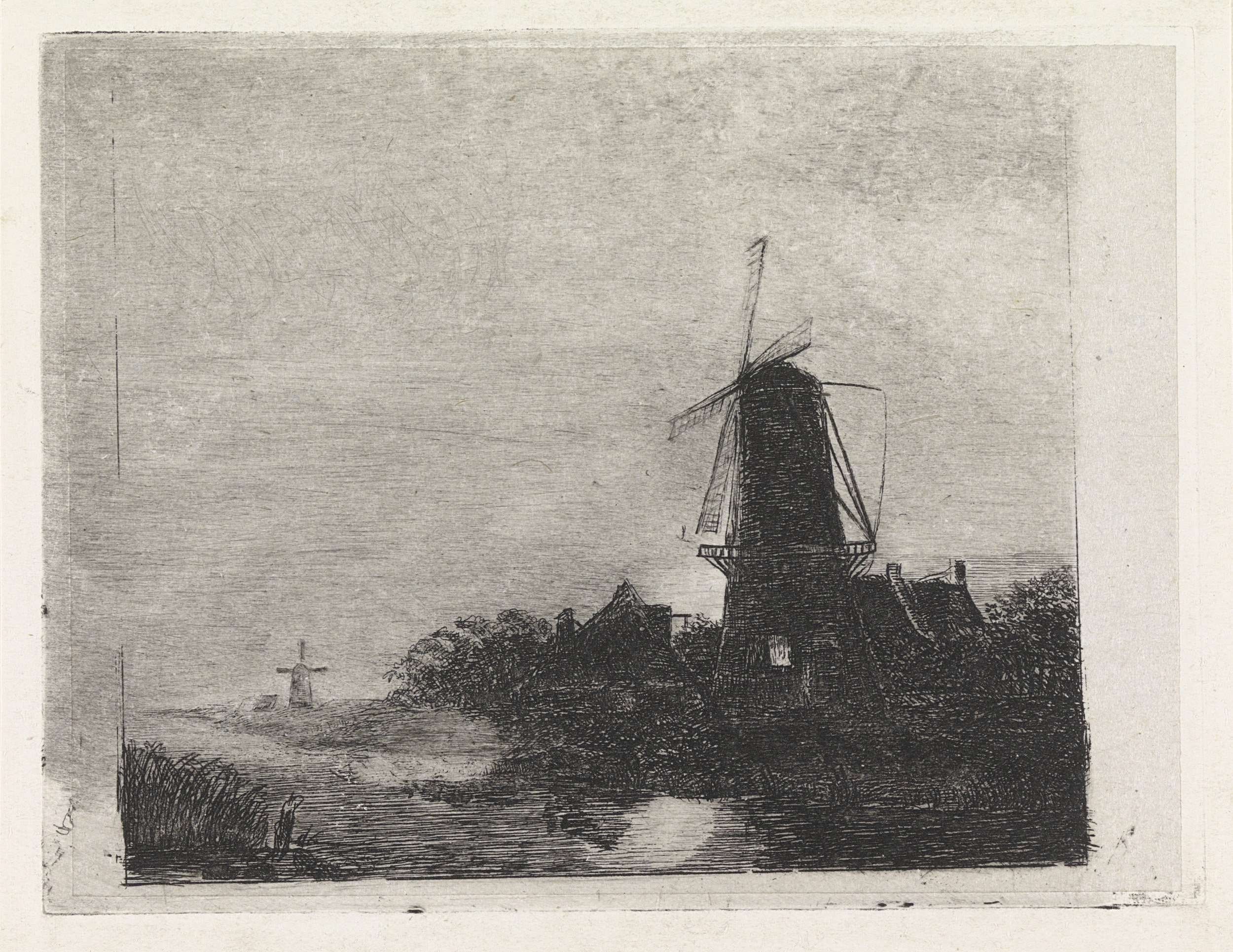 Avondlandschap met twee molens en huizen aan een vaart. In de molen op de voorgrond brandt licht.