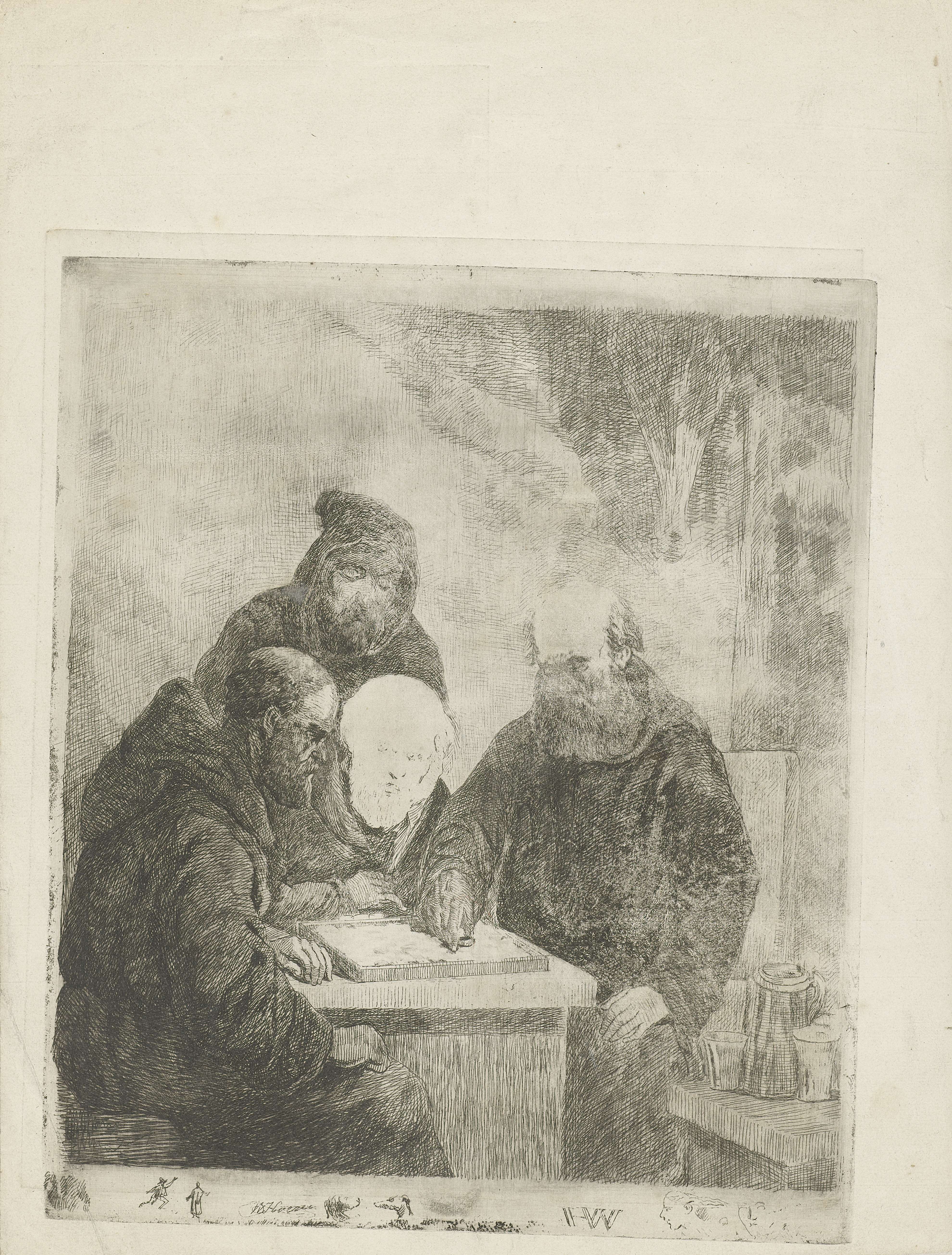 Vier monniken bij een dambord. Terwijl twee monniken een spelletje dam spelen, kijken de andere twee toe. Op de tafel naast de monniken staan een kan en twee glazen. In de marge zijn onder andere twee hondenkoppen, twee figuren en het hoofd van een mens te zien. Druk van dezelfde plaat en dezelfde staat op ...