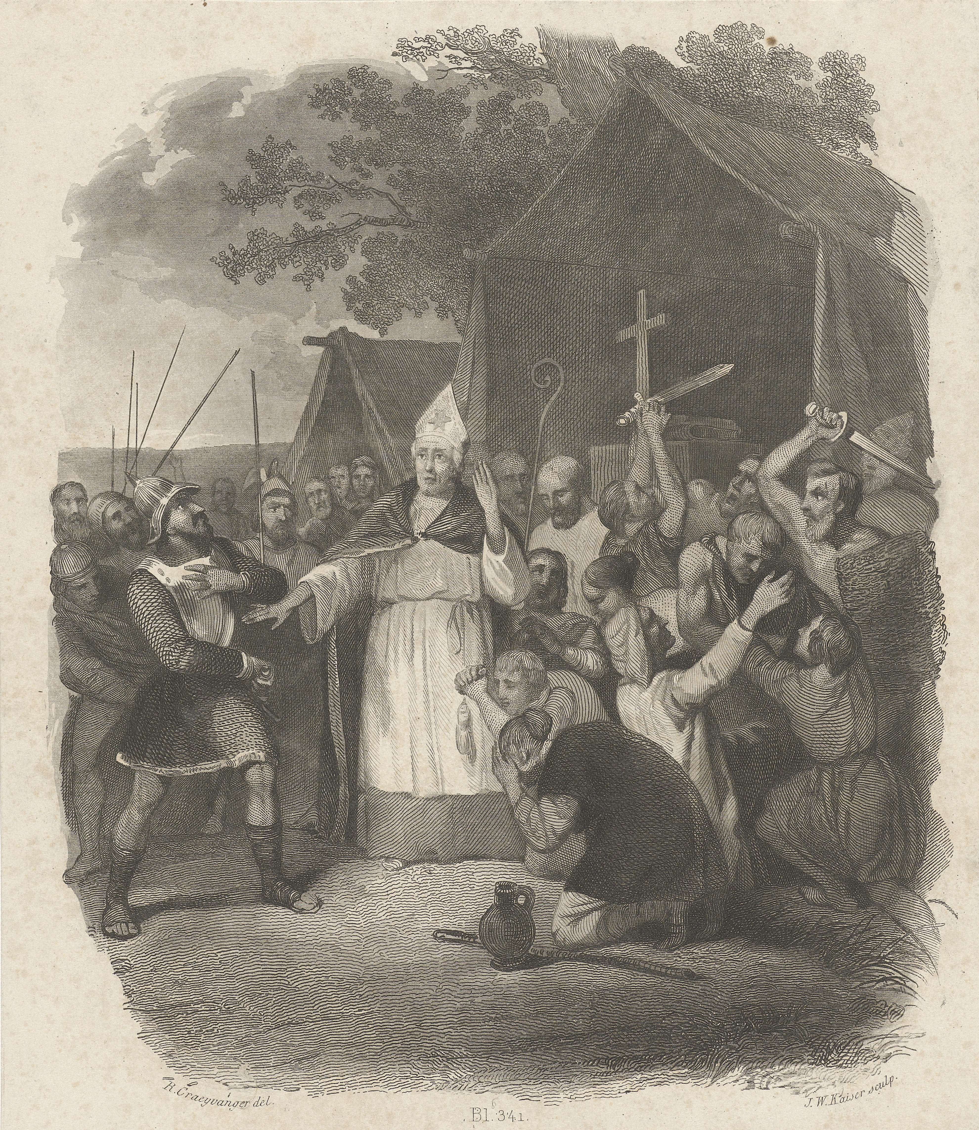 De marteldood van Bonifatius en zijn 53 volgelingen te Dokkum, in het jaar 754. Bonifatius staat voor een van zijn tenten te midden van een groep soldaten. Enkele soldaten hebben hun zwaard hebben getrokken. Links staat een krijgsman die zijn zwaard uit zijn schede haalt om de twee geknielde volgelingen van de bisschop te onthoofden.