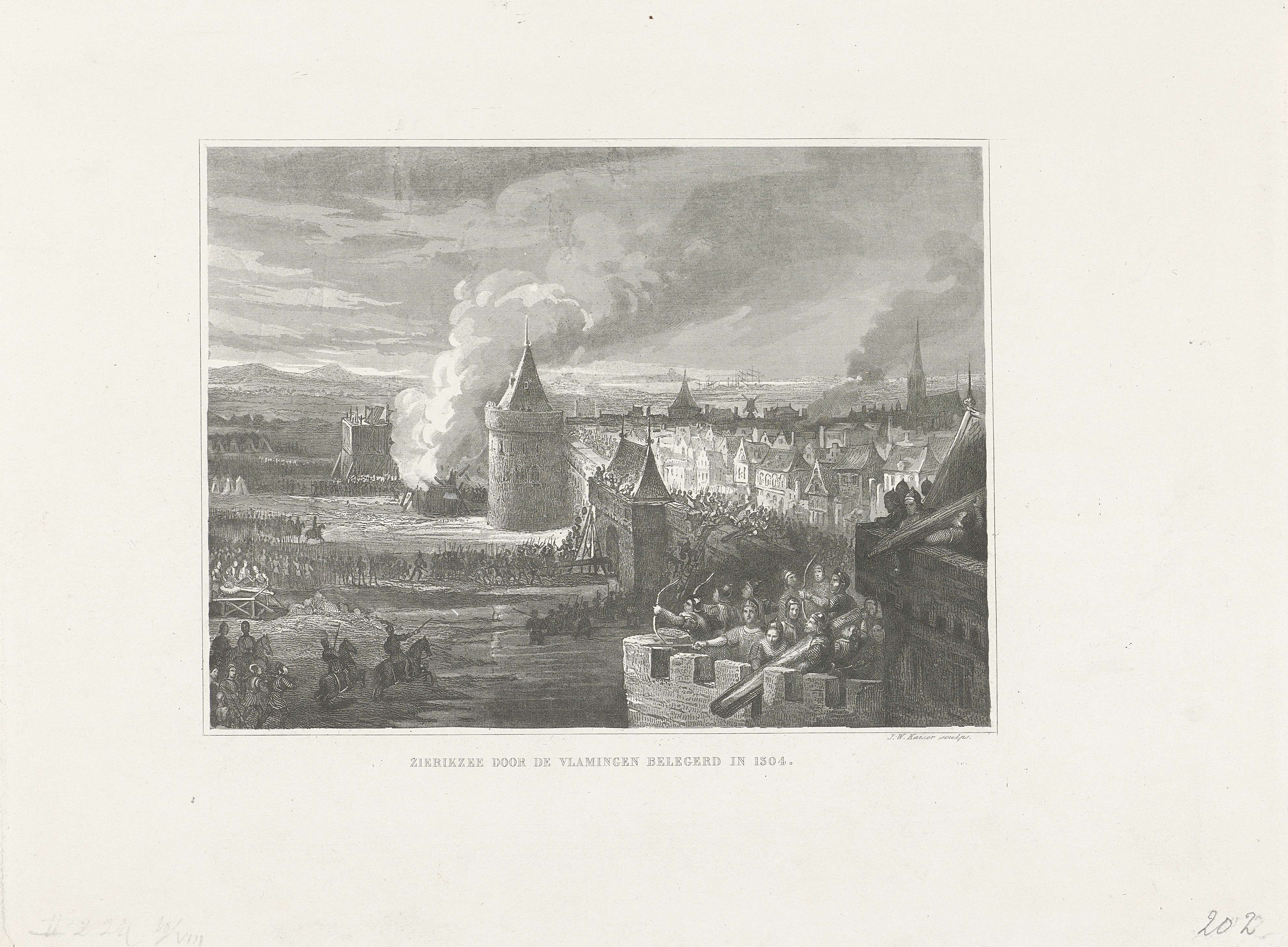 Zierikzee door de Vlamingen belegerd, 10 augustus 1304. Gezicht vanuit een toren op de stadsmuren van Zierikzee waar gevochten wordt tussen de Zeeuwen en de Vlamingen.