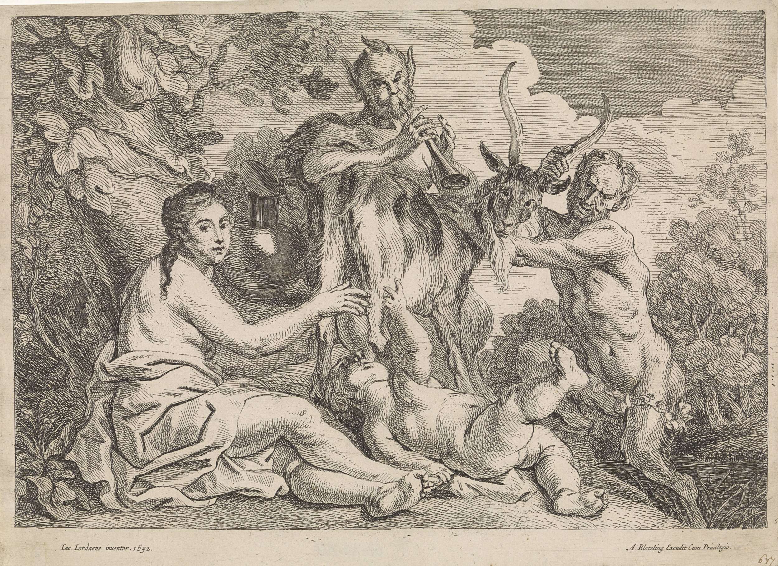 Een sater en een halfnaakte nimf houden de geit Amalthea vast. Het kind Jupiter drinkt melk uit een van de uiers van de geit. Een tweede sater bespeelt een fluit.
