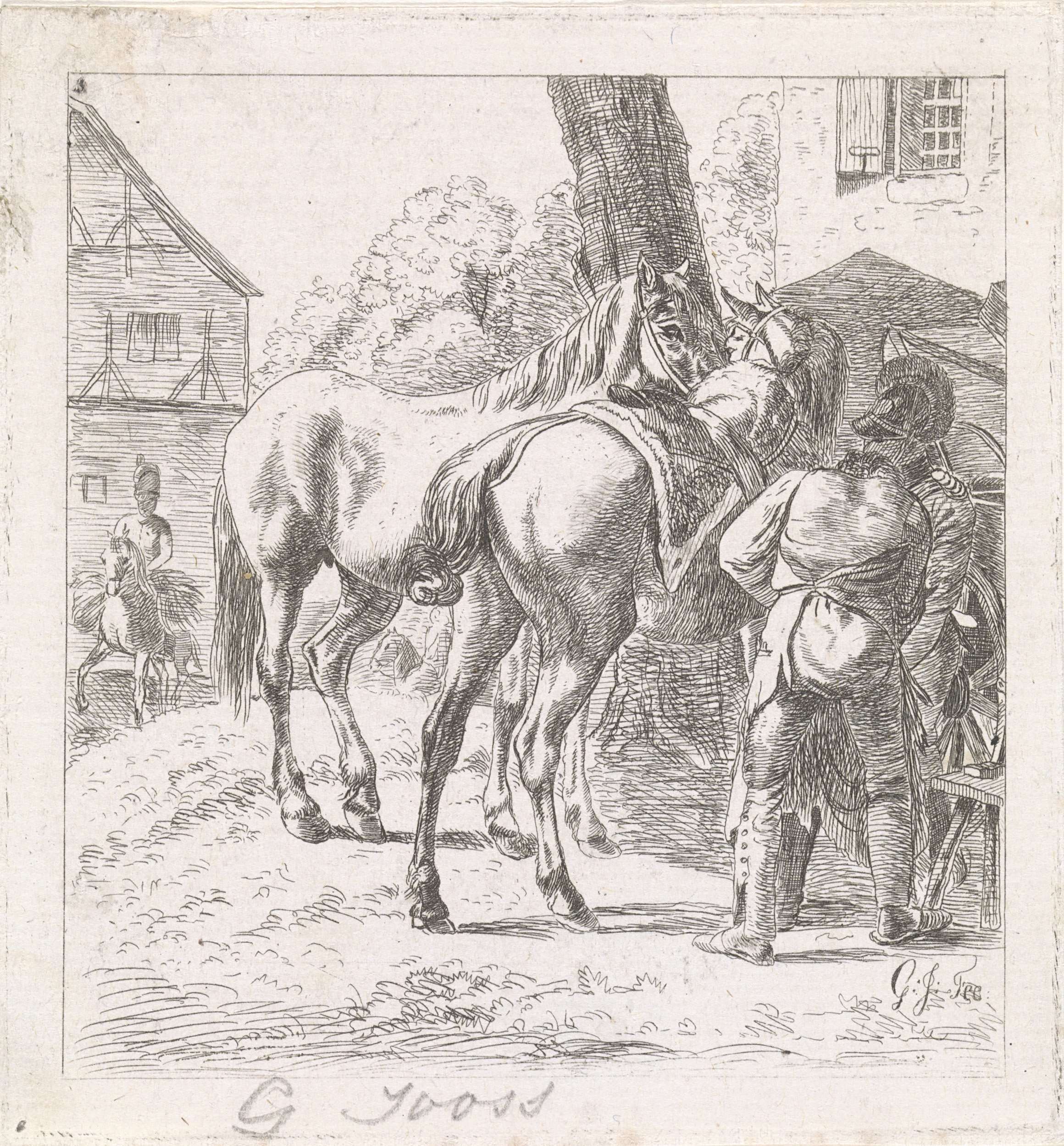 Twee paarden, waarvan er één gezadeld is, bij de hoefsmid. Rechts staan de hoefsmid en een soldaat. Op de achtergrond twee figuren te paard.