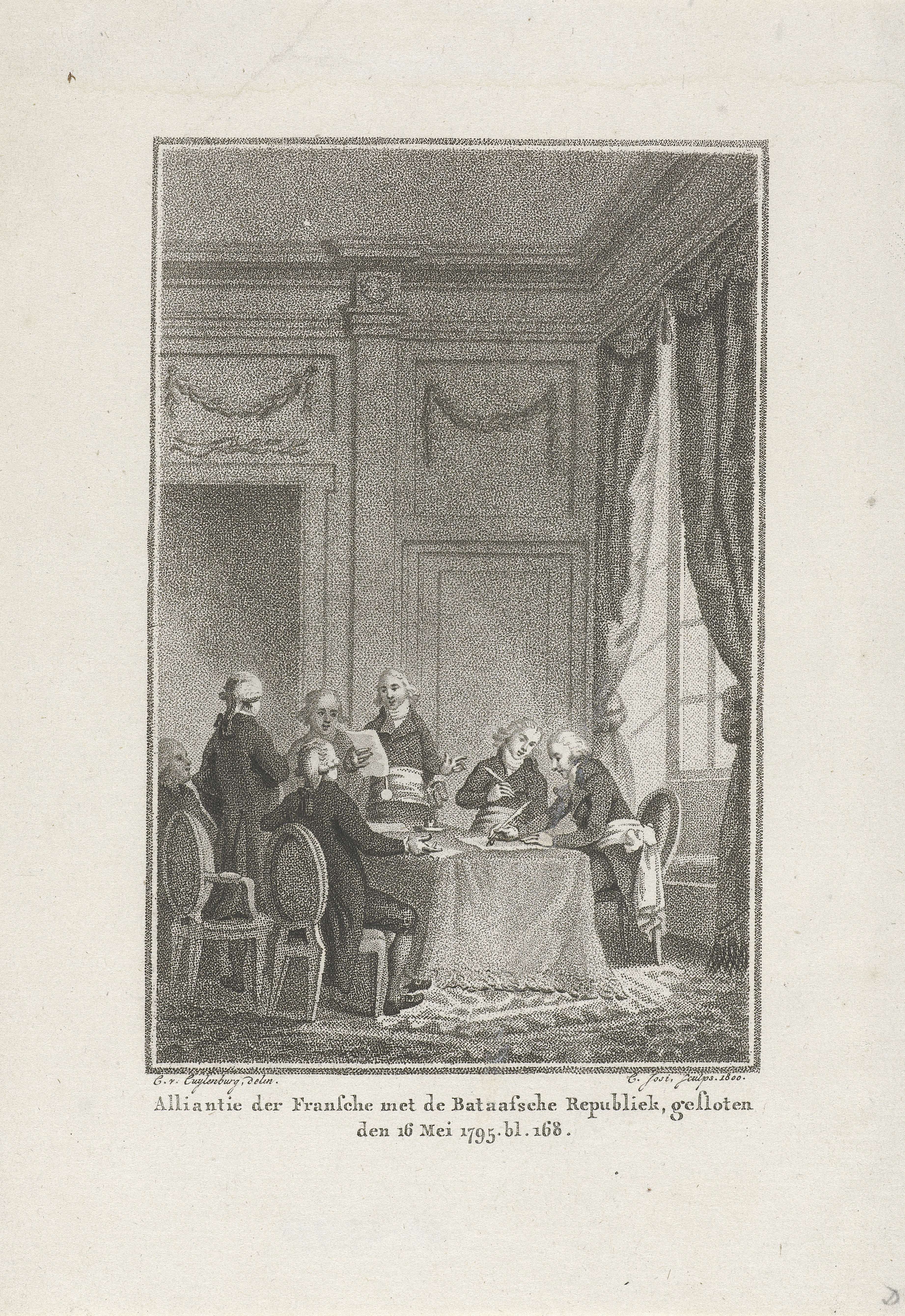 Interieur met diverse figuren aan en rondom een tafel. Enkele van hen schrijven, één van hen staat en leest voor van een vel papier. Ze sluiten een alliantie tussen Frankrijk en de Bataafse Republiek, op 16 mei 1795.