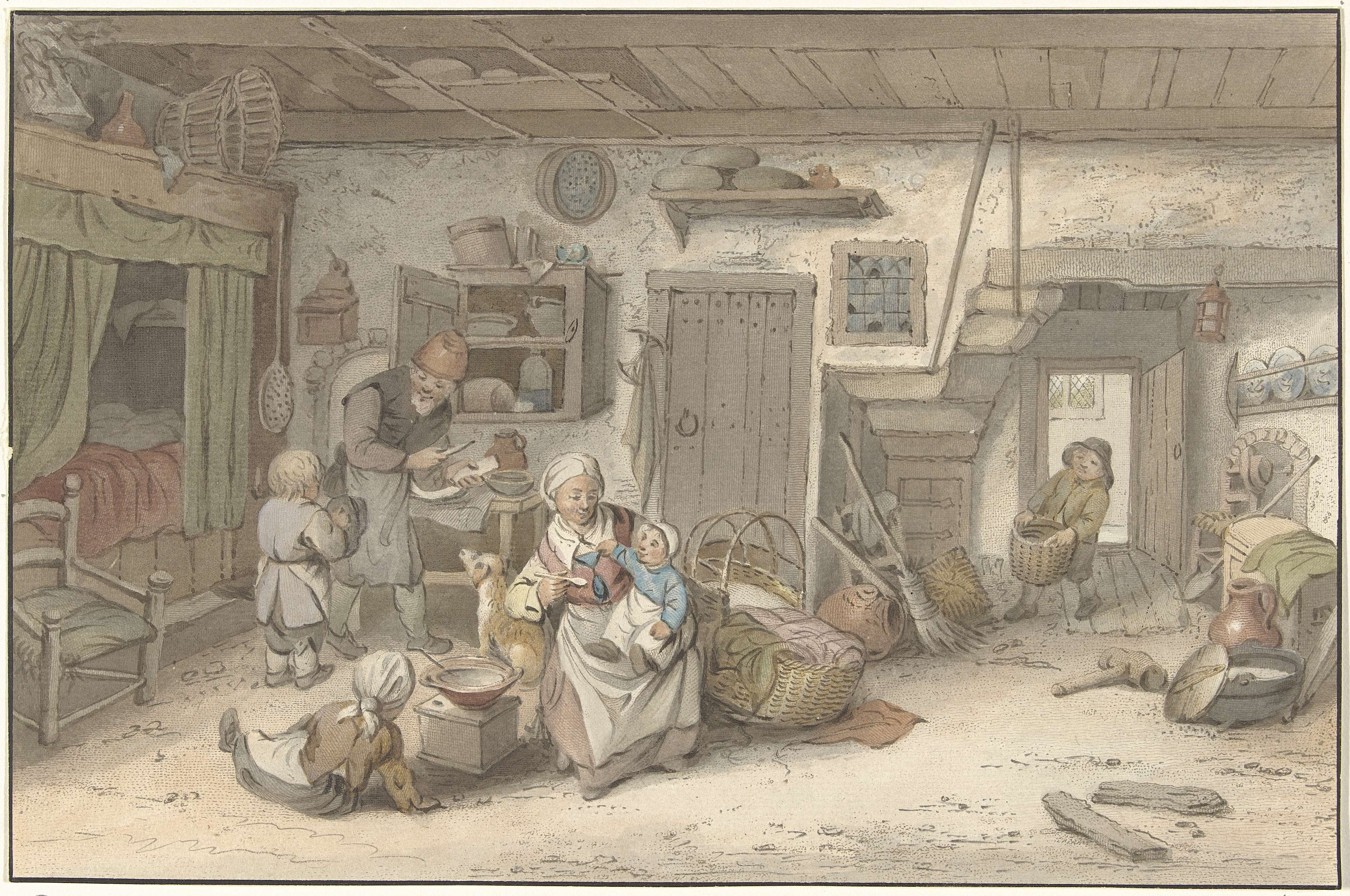 Interieur van een boerderij met allerlei huisraad en een bedstee. Een vrouw heeft een kind op schoot en geeft dit te eten. Achter haar staat haar man, hij heeft een mes in zijn hand. Rechts komt een kind aangelopen met een mand in de hand.