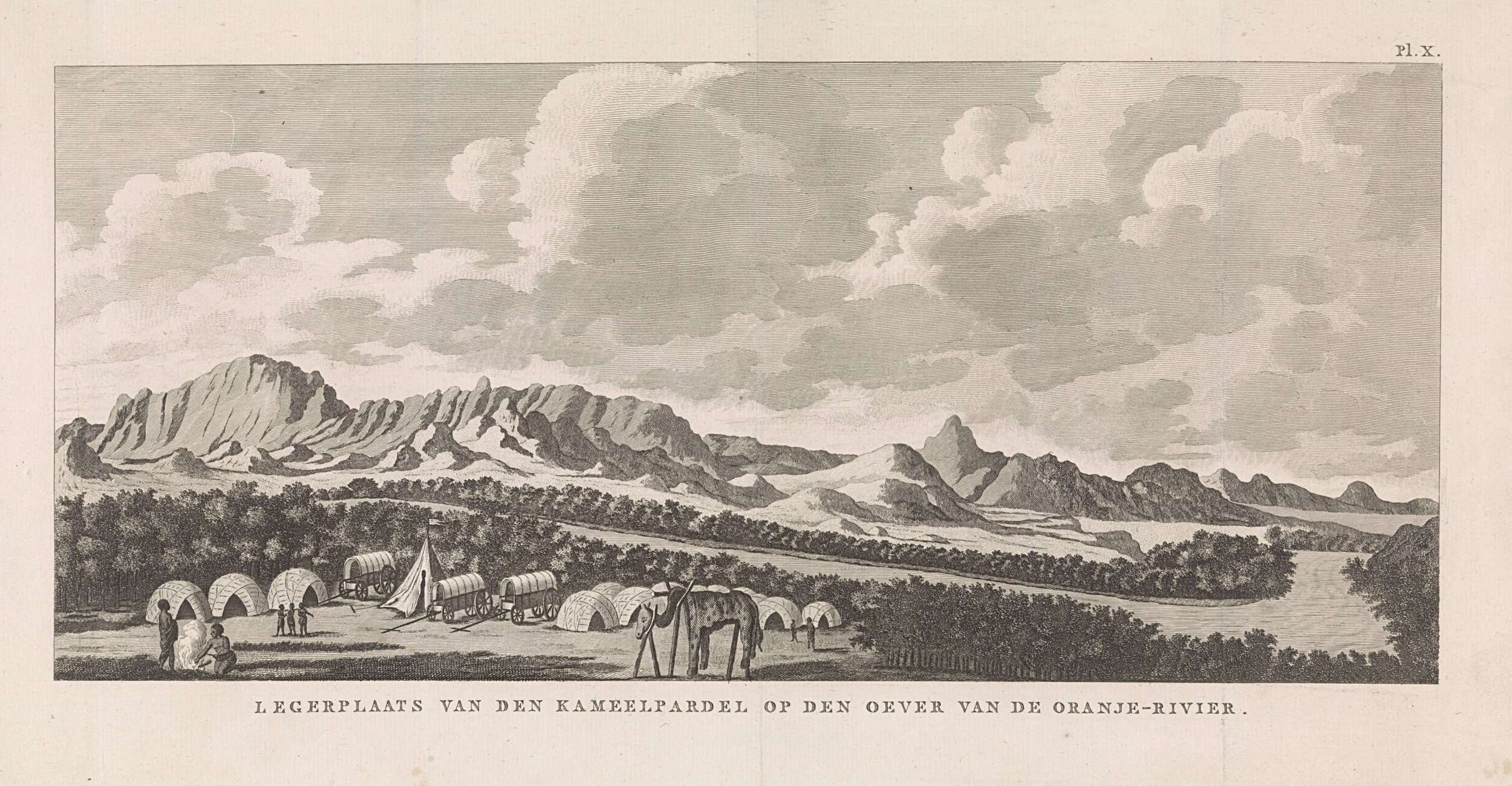Bergachtig landschap met rivier. Op de voorgrond, aan de oever, een kampement en enkele figuren. Op de voorgrond hangt de huid van een geschoten giraf te drogen. Kampement van François Levaillant tijdens één van zijn reizen door de binnenlanden van Zuid-Afrika in de periode 1780-1785. Rechtsboven: Pl. X.