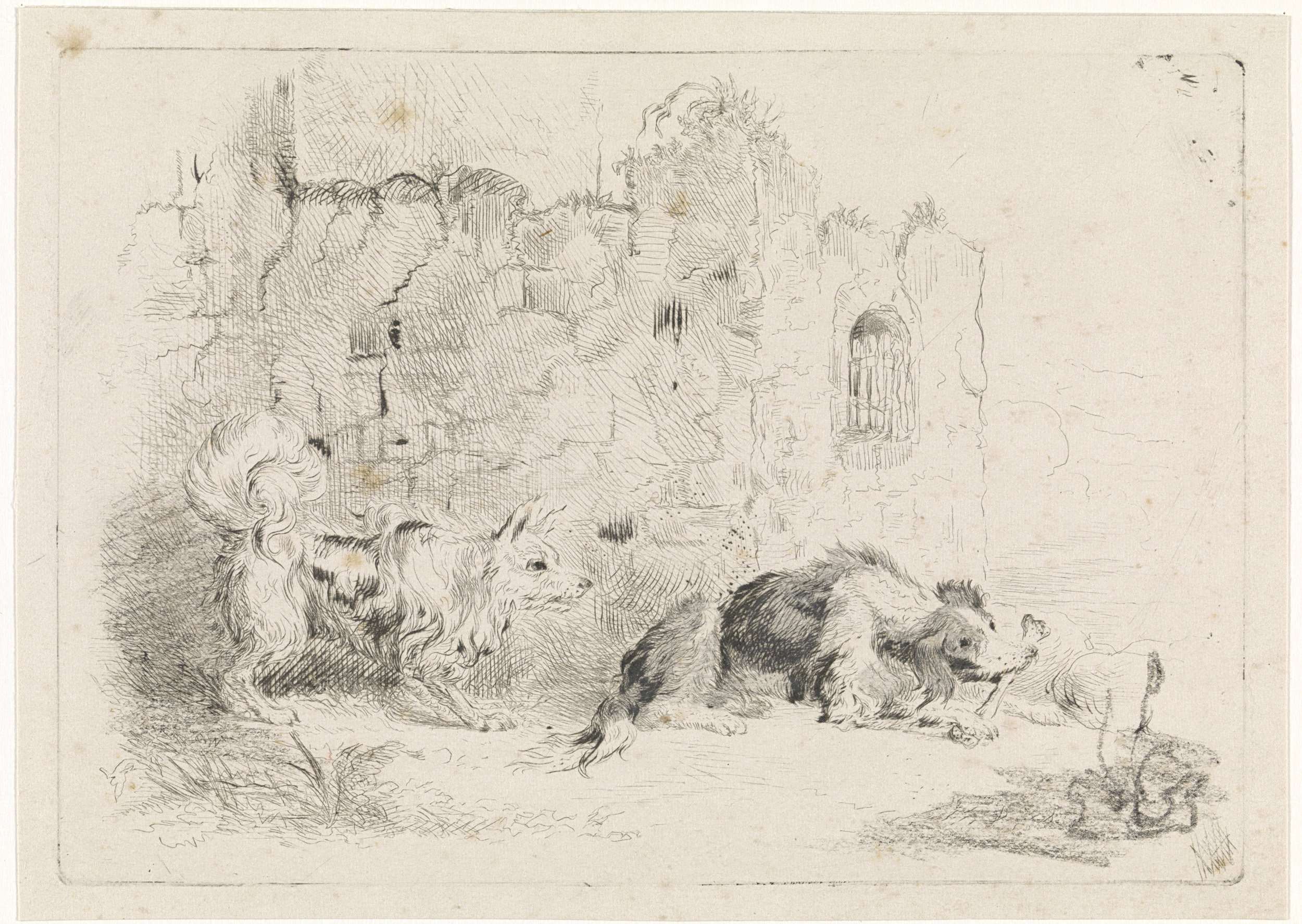 Landschap met ruïne en twee honden, één van hen kluift op een bot.