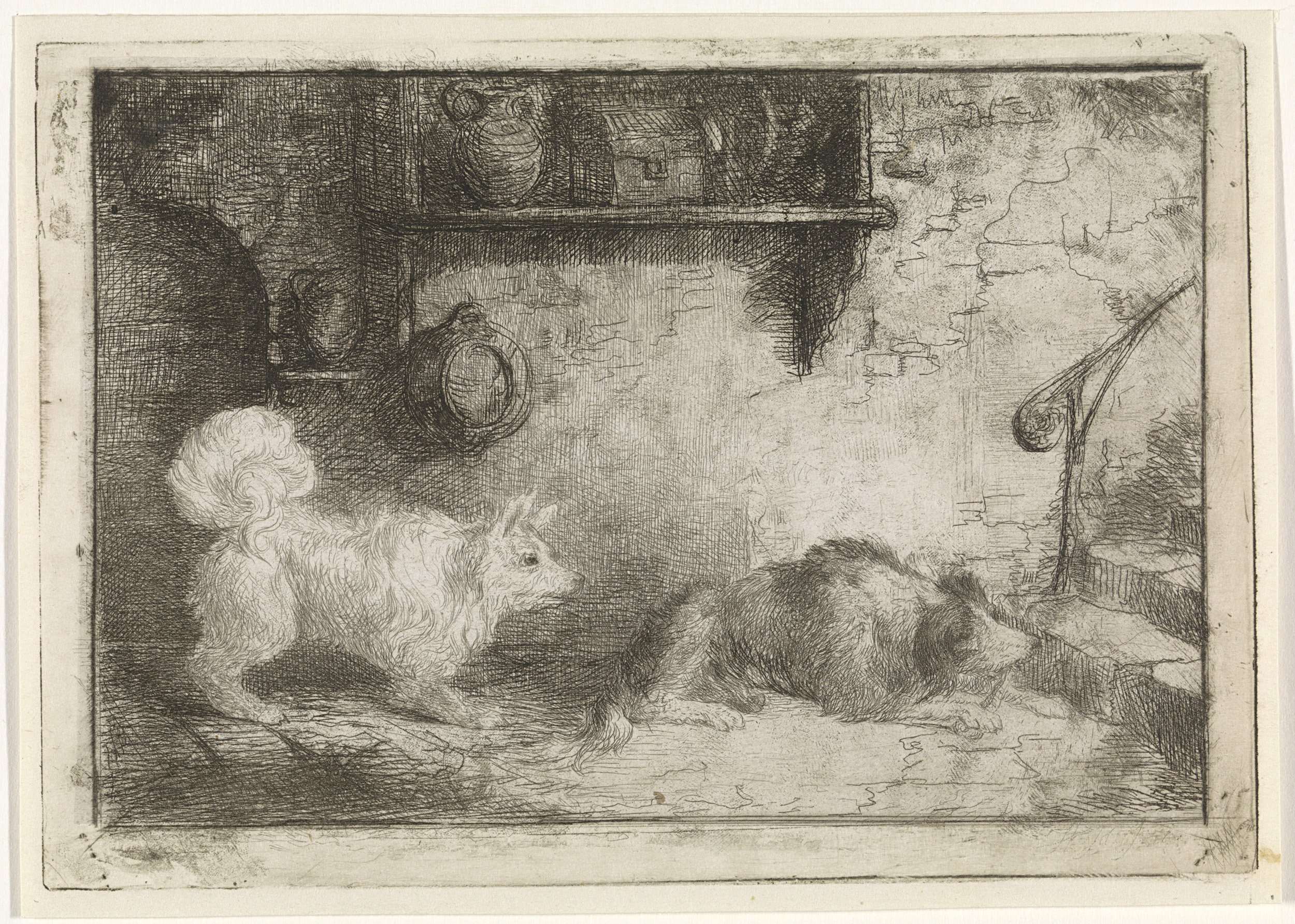 Interieur met huisraad en twee honden, één van hen kluift op een bot. Rechts een trap.