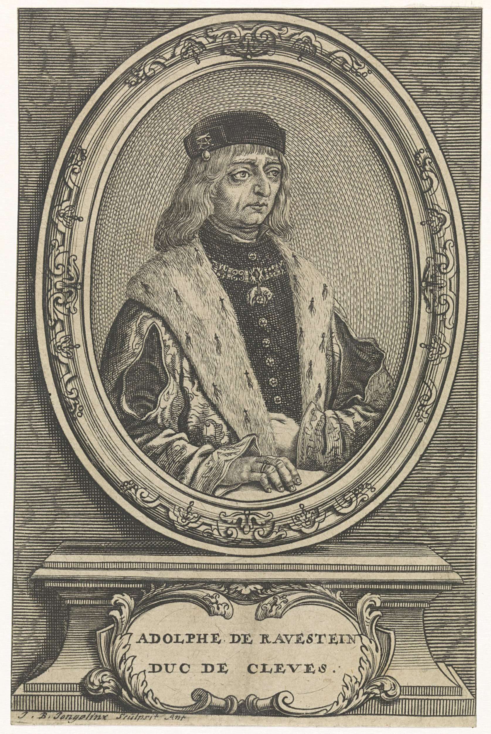 Busteportret van Adolf van Kleef, met baret. Hij draagt een keten met de Orde van het Gulden Vlies. Zijn linkerhand heeft hij in zijn mantel gestoken. Het portret is gevat in een ovale omlijsting met decoraties. In een cartouche een tweeregelig onderschrift in het Frans.