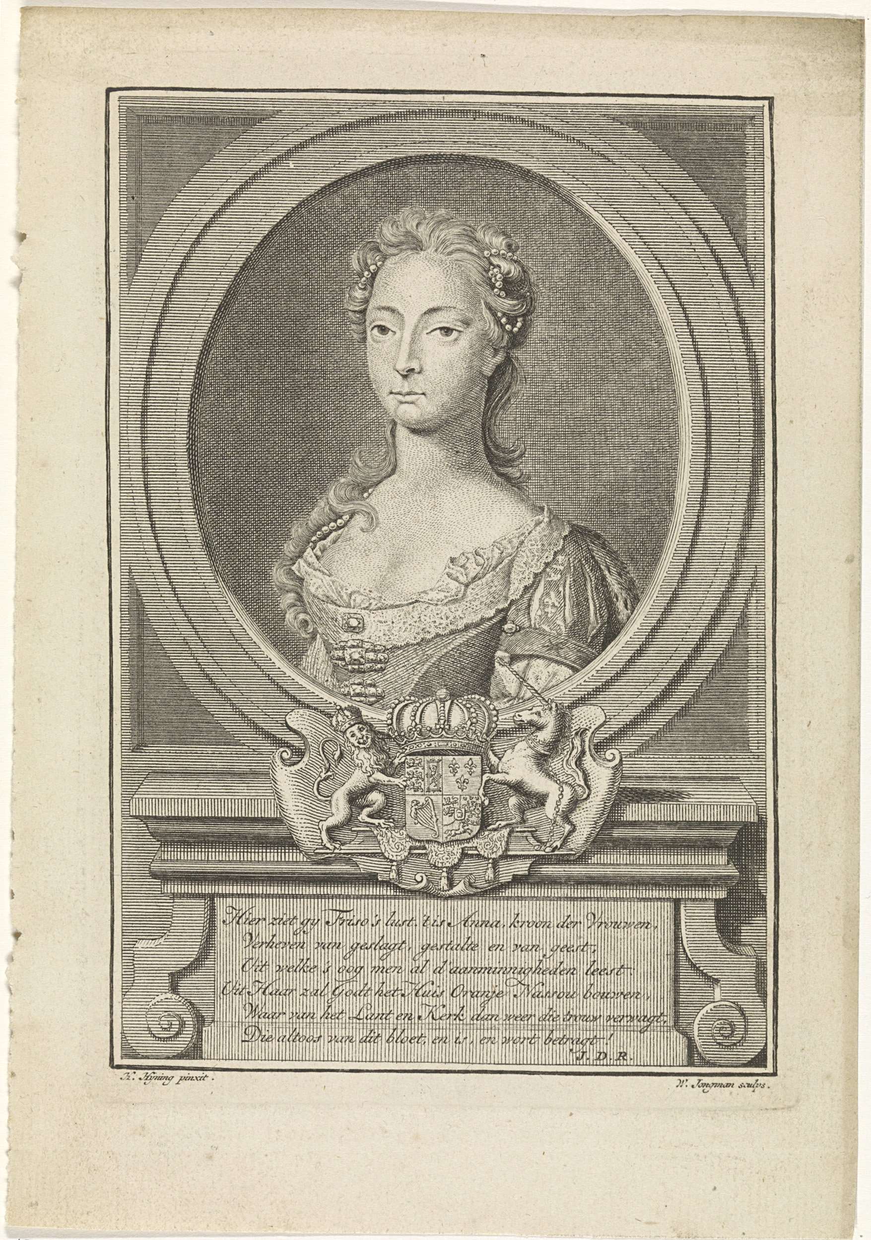 Busteportret van Anna van Hannover, in jurk. Het portret is gevat in een ovale omlijsting met een bekroond wapenschild van de geportretteerde. In een kader op de piëdestal een zesregelig gedicht in het Nederlands.
