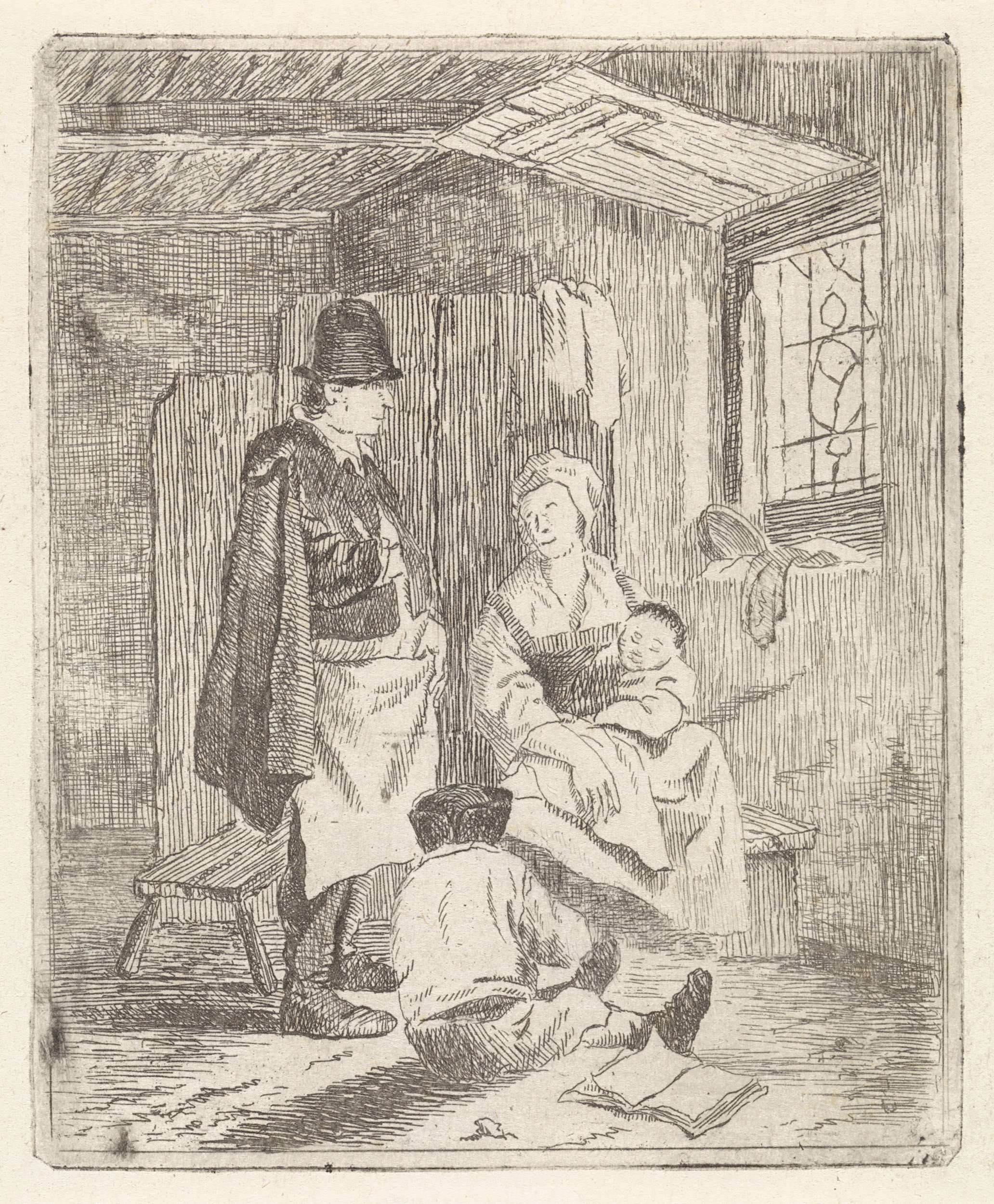 Interieur met man en vrouw met kind op schoot. Bij hen twee kinderen, van wie er een in een boek kijkt.