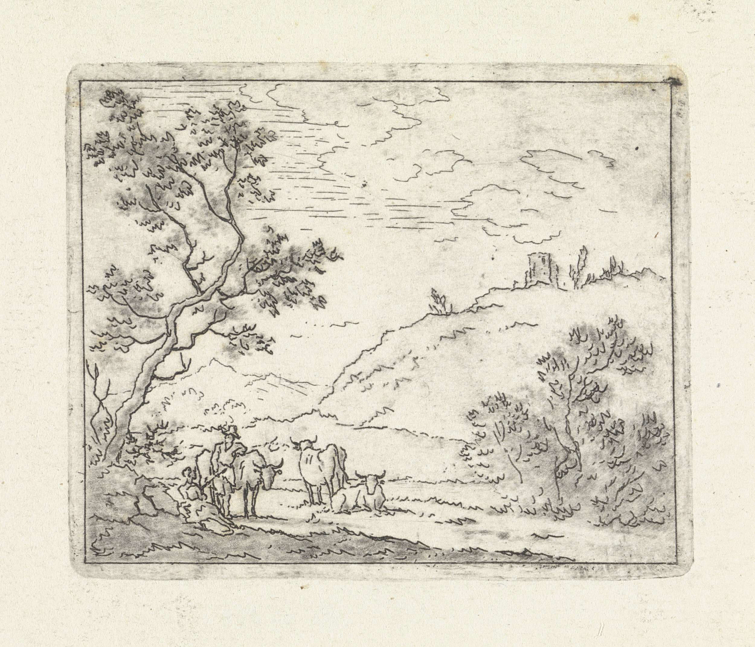 Heuvelachtig landschap met herder, leunend op een koe, in gesprek met een zittende herderin. Naast hen twee koeien. Op de achtergrond op een heuvel een toren.