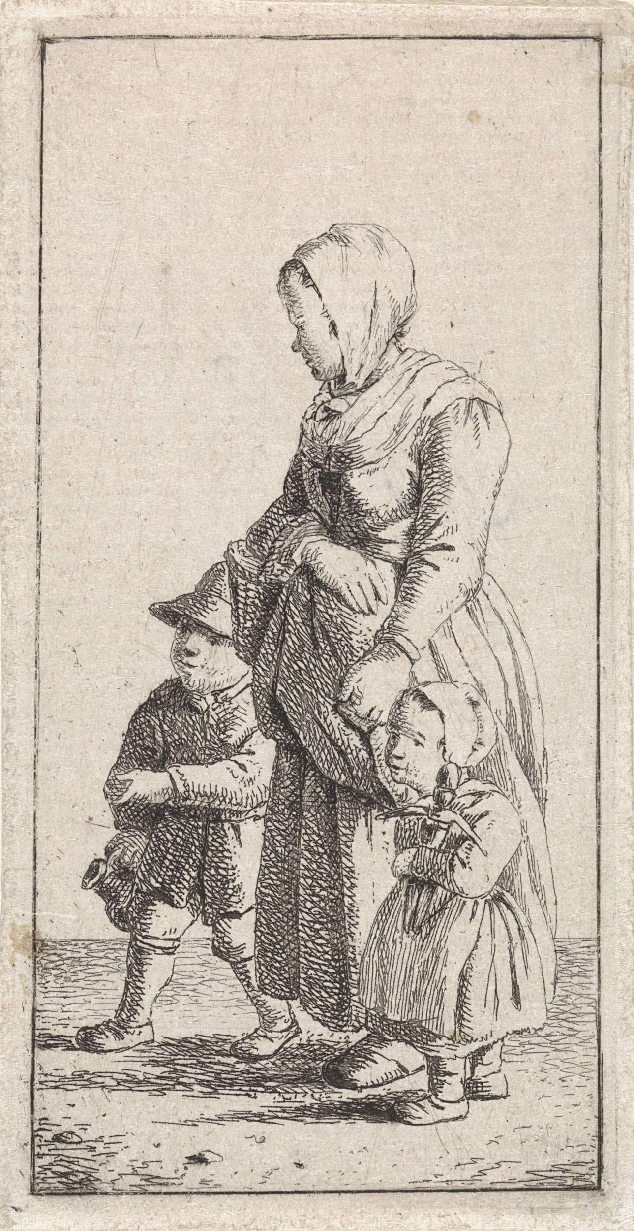 Vrouw met mand, lopend naar links. Rechts naar haar loopt een jongen met een kan in zijn rechterhand. Met haar linkerhand houdt ze de hand van een meisje vast. Het meisje heeft een pop vast. Meer bewerkt dan vorige staat. Prent uit een serie met vrouwen en kinderen.