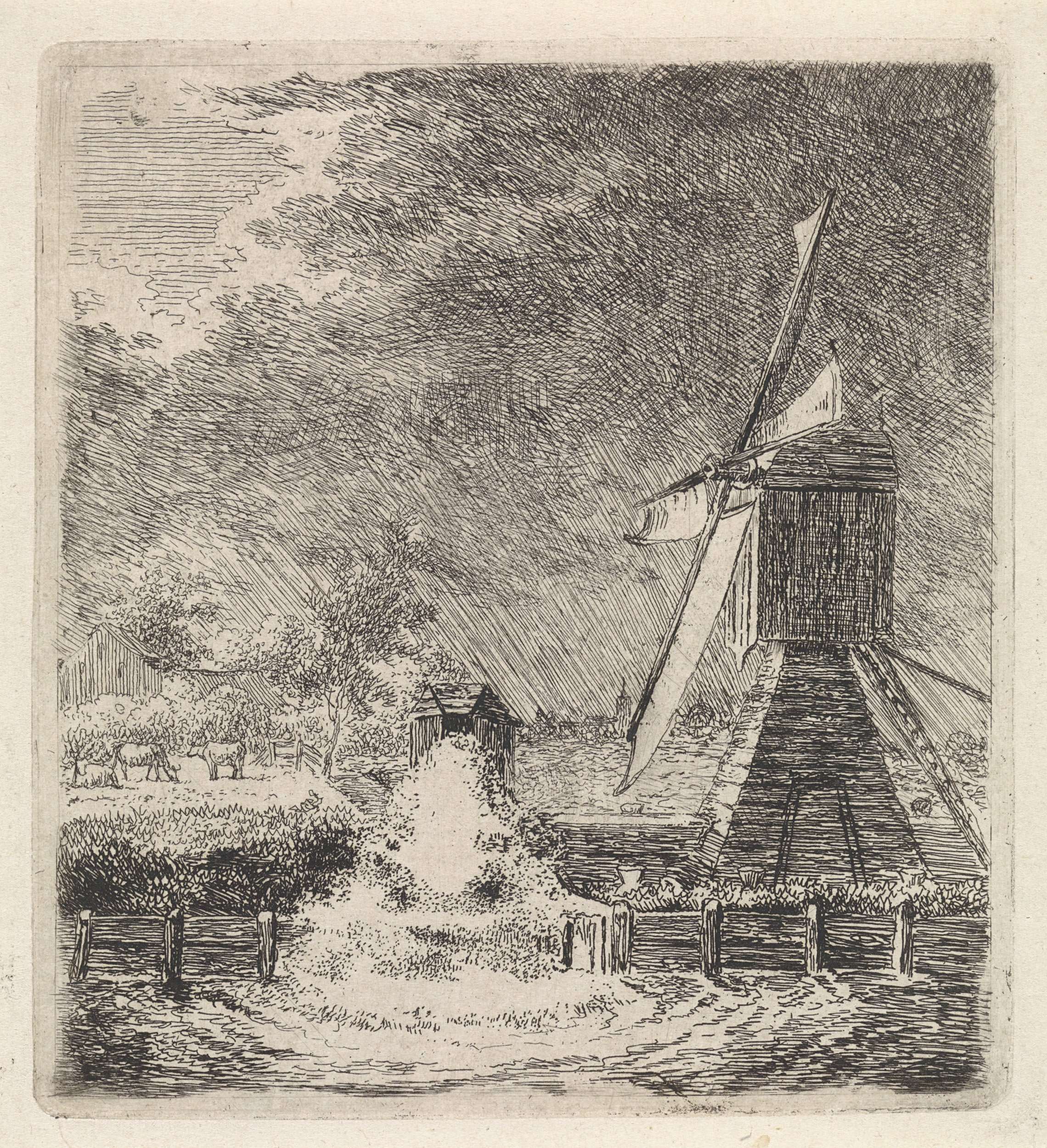 Landschap met watermolen, met water in rivier stromend. Links op de achtergrond een boerderij en koeien in de wei.