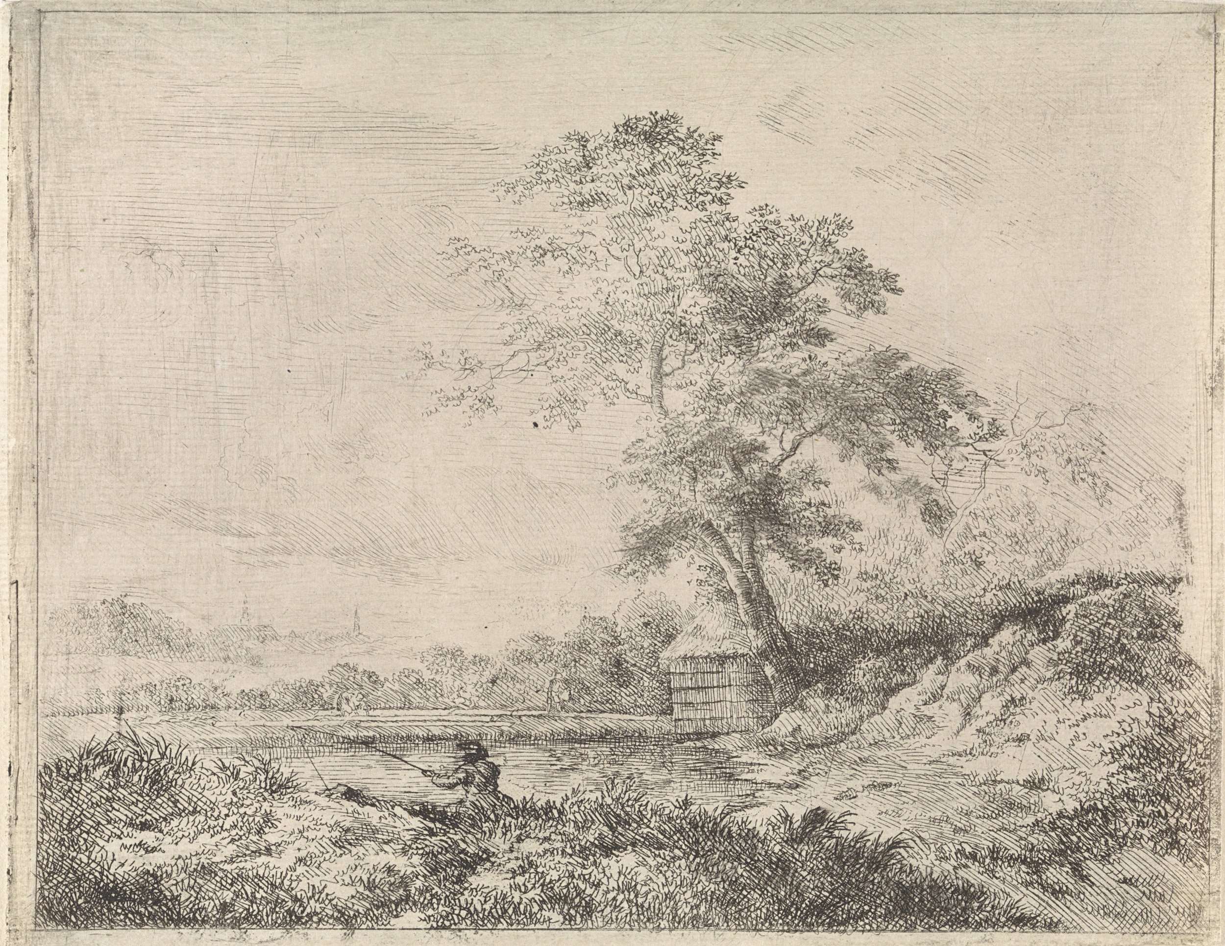 Landschap met visser bij een meer. Rechts een hutje bij een boom.