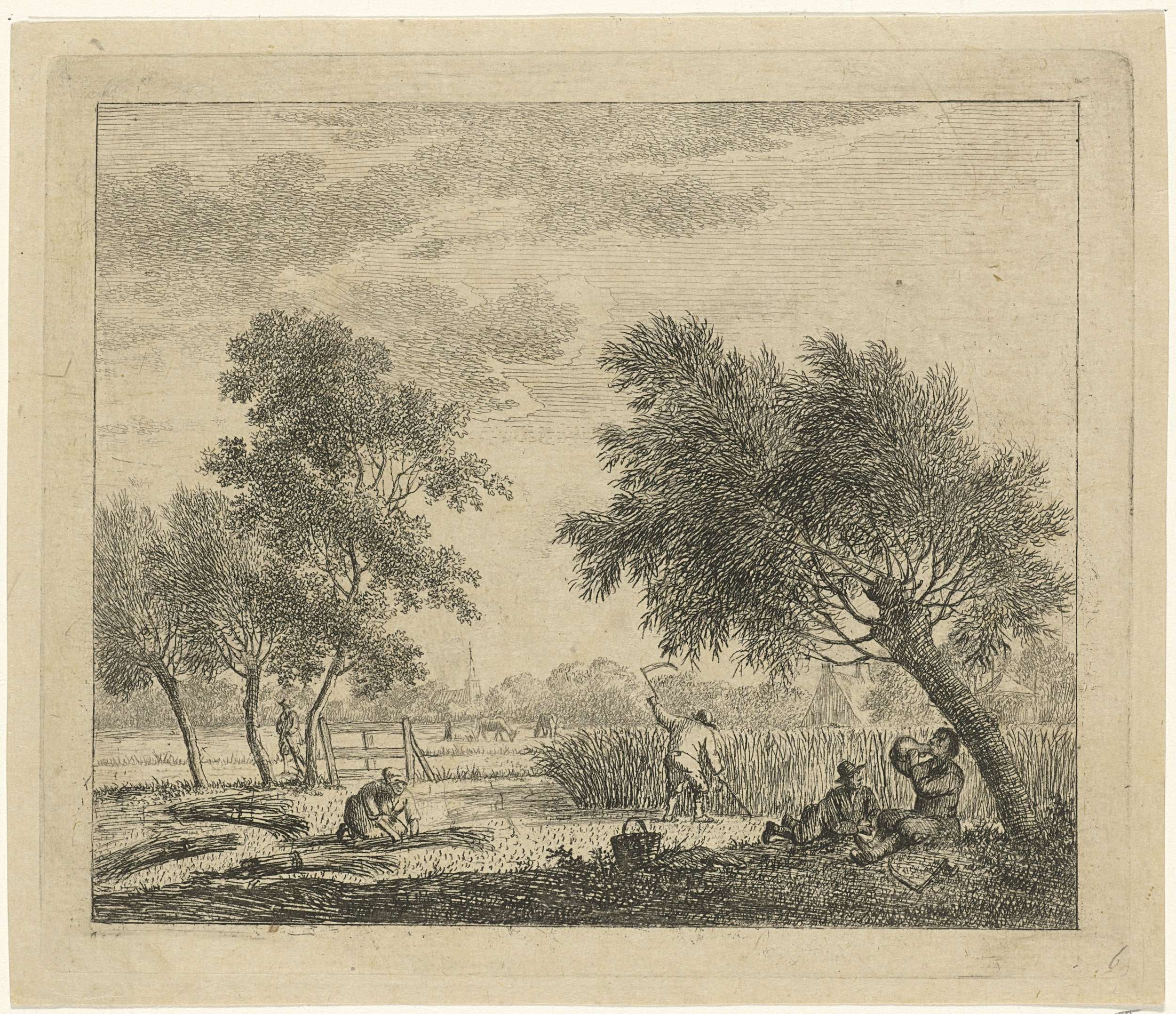 Landschap met boerin die koren bijeen bindt en een boer die koren oogst. Rechts op de voorgrond twee mannen, zittend en liggend onder een boom (aangepast ten opzichte van vorige staten). Links op de achtergrond een wandelende man. Negende prent uit een serie van dertien met maanden.
