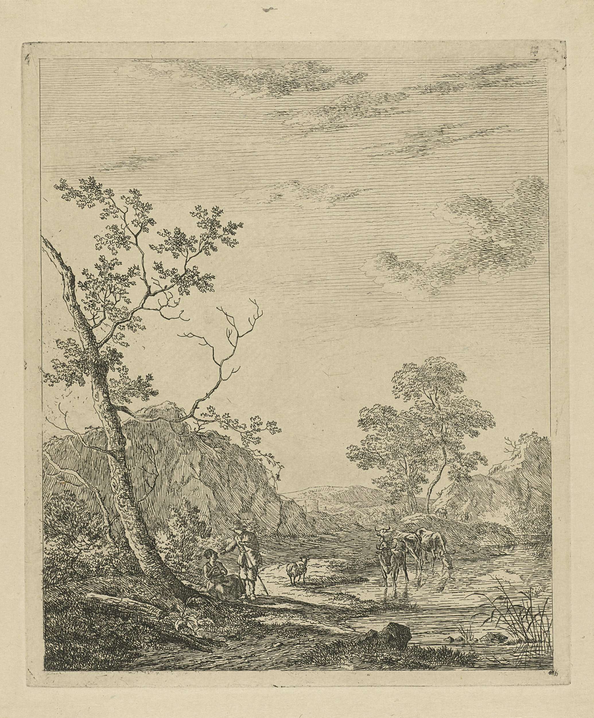 Heuvelachtig landschap met koeien in rivier en een schaap op een pad. Bij de boom links een zittende vrouw in gesprek met een man. Op de achtergrond een toren. Mét de lucht.