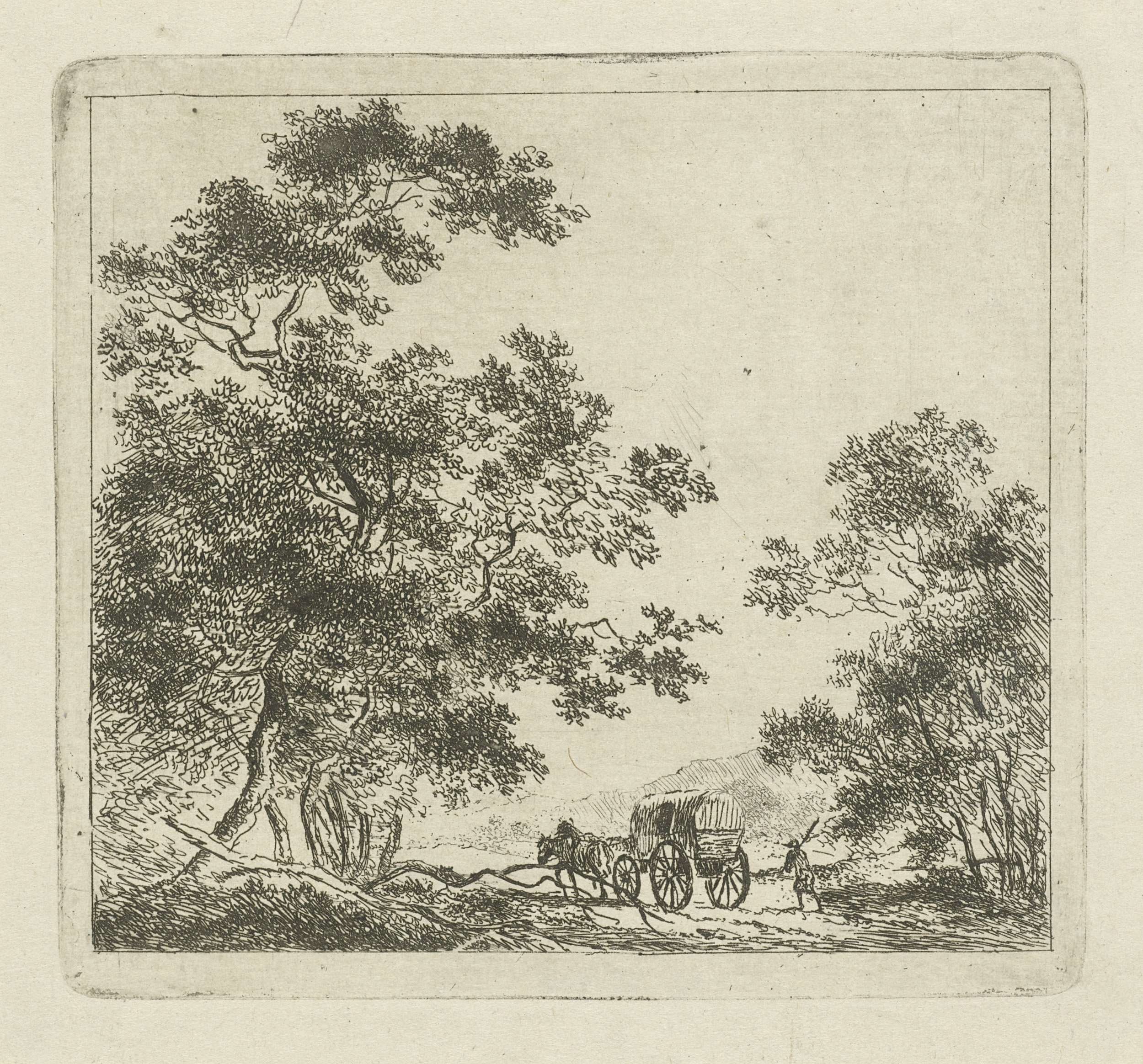 Bosweg met postwagen en een lopende figuur, op de rug gezien. Vóór de lucht.