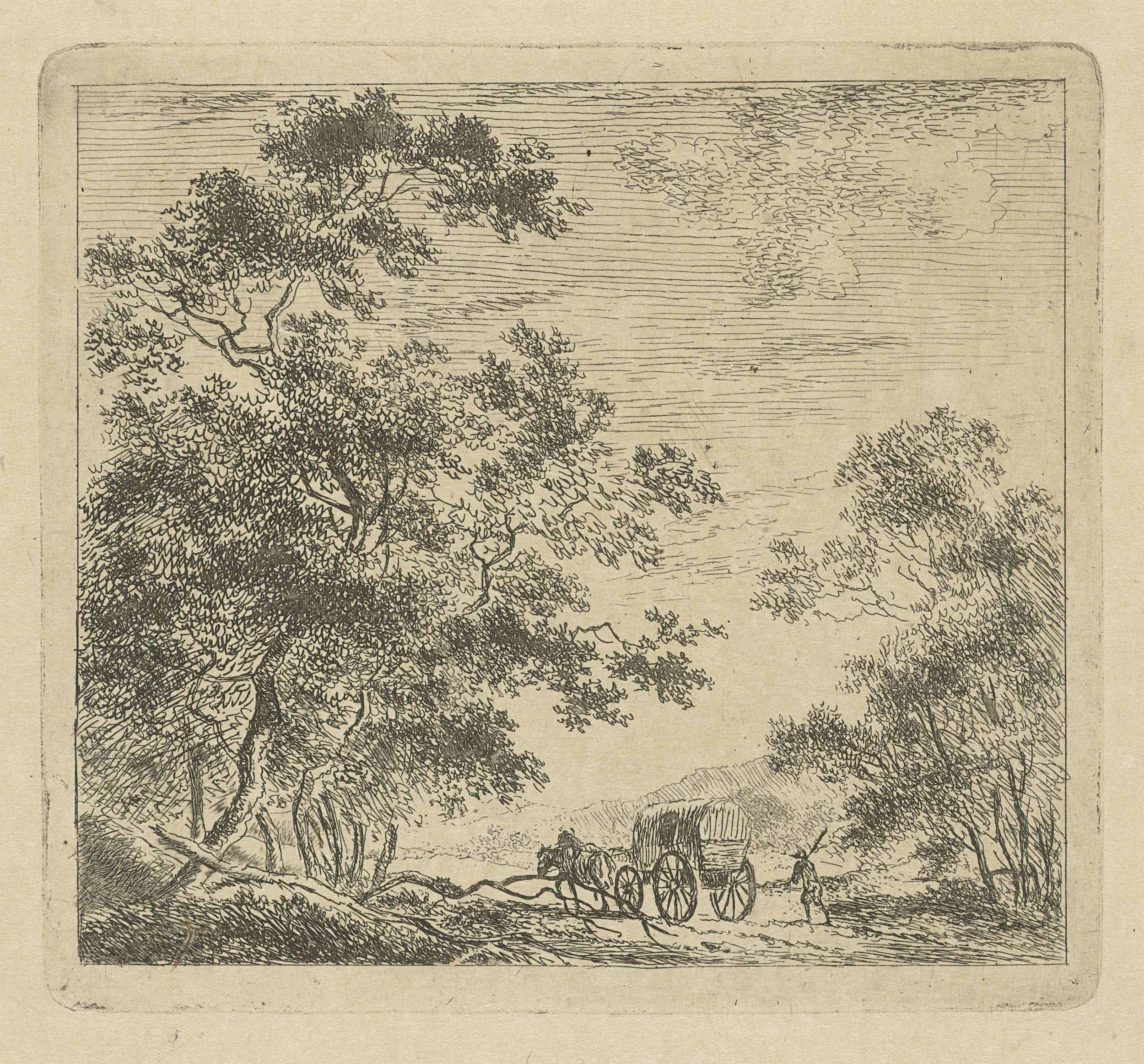 Bosweg met postwagen en een lopende figuur, op de rug gezien. Mét de lucht.