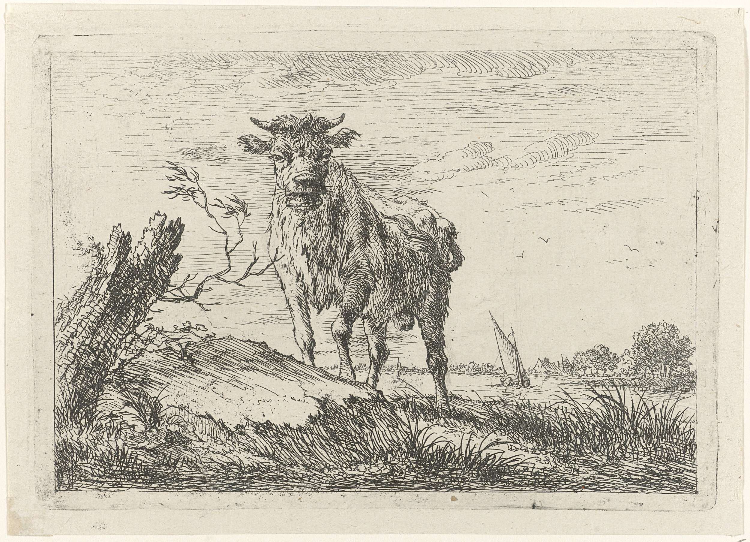 Een brullende stier aan de oever van een rivier, links een boomstronk. Prent uit een serie met landschappen met vee.