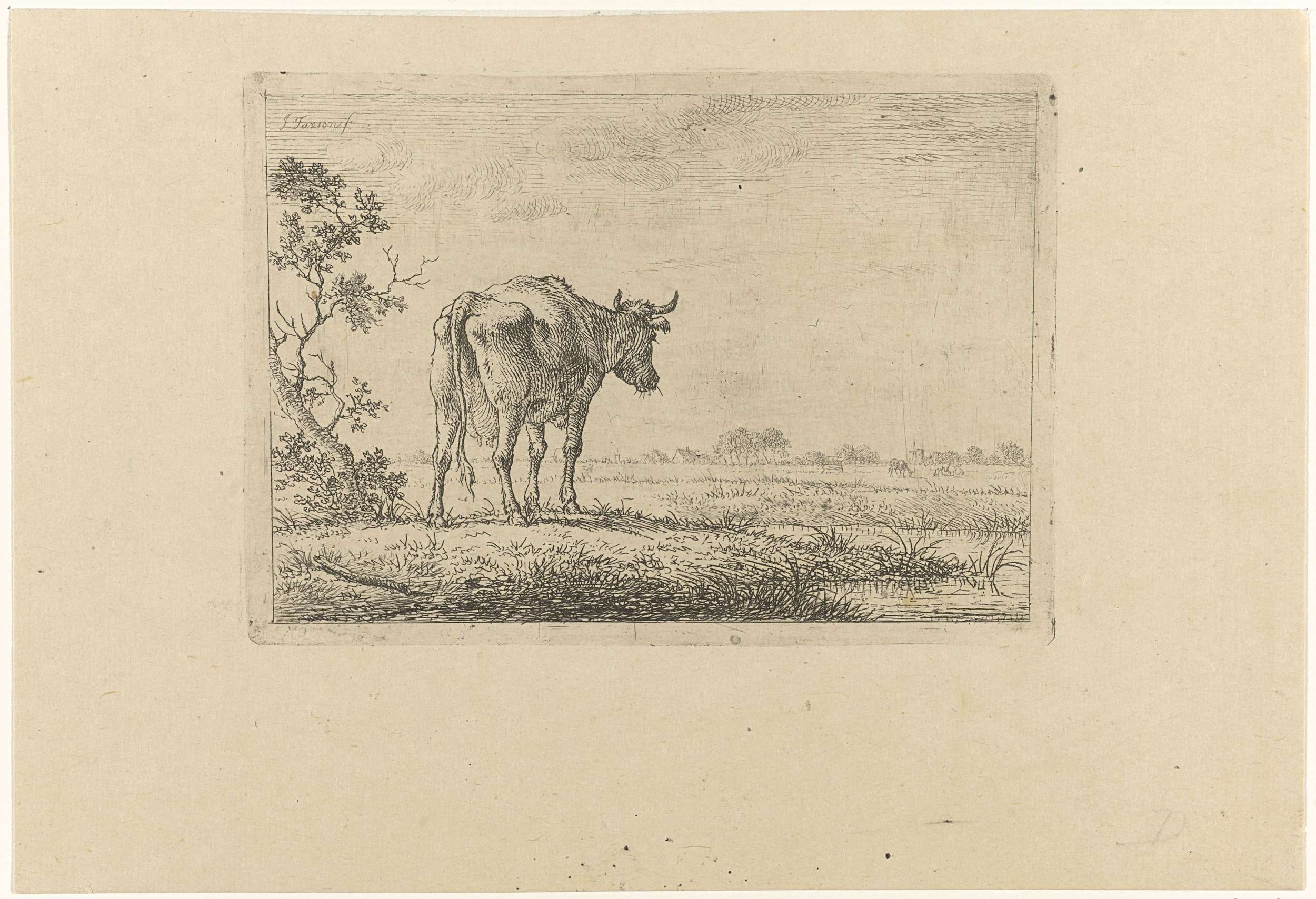 Koe in weiland, staand bij water, op de rug gezien. Prent uit een serie met landschappen met vee.