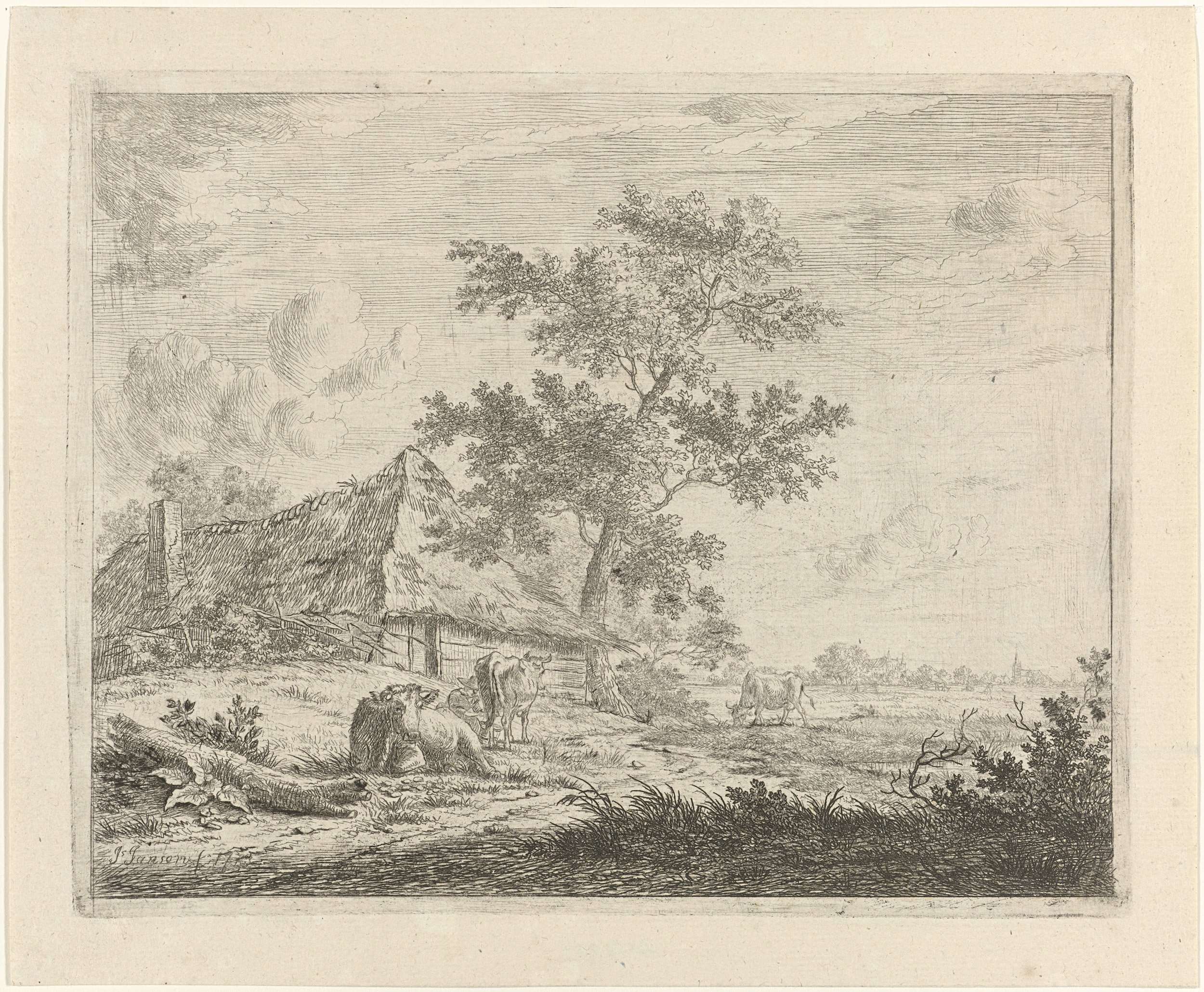 Landschap met boerderij en drie koeien in een weiland. Eén van de koeien wordt gemolken door een vrouw. Kopie naar gelijknamige prent van Johannes Janson.