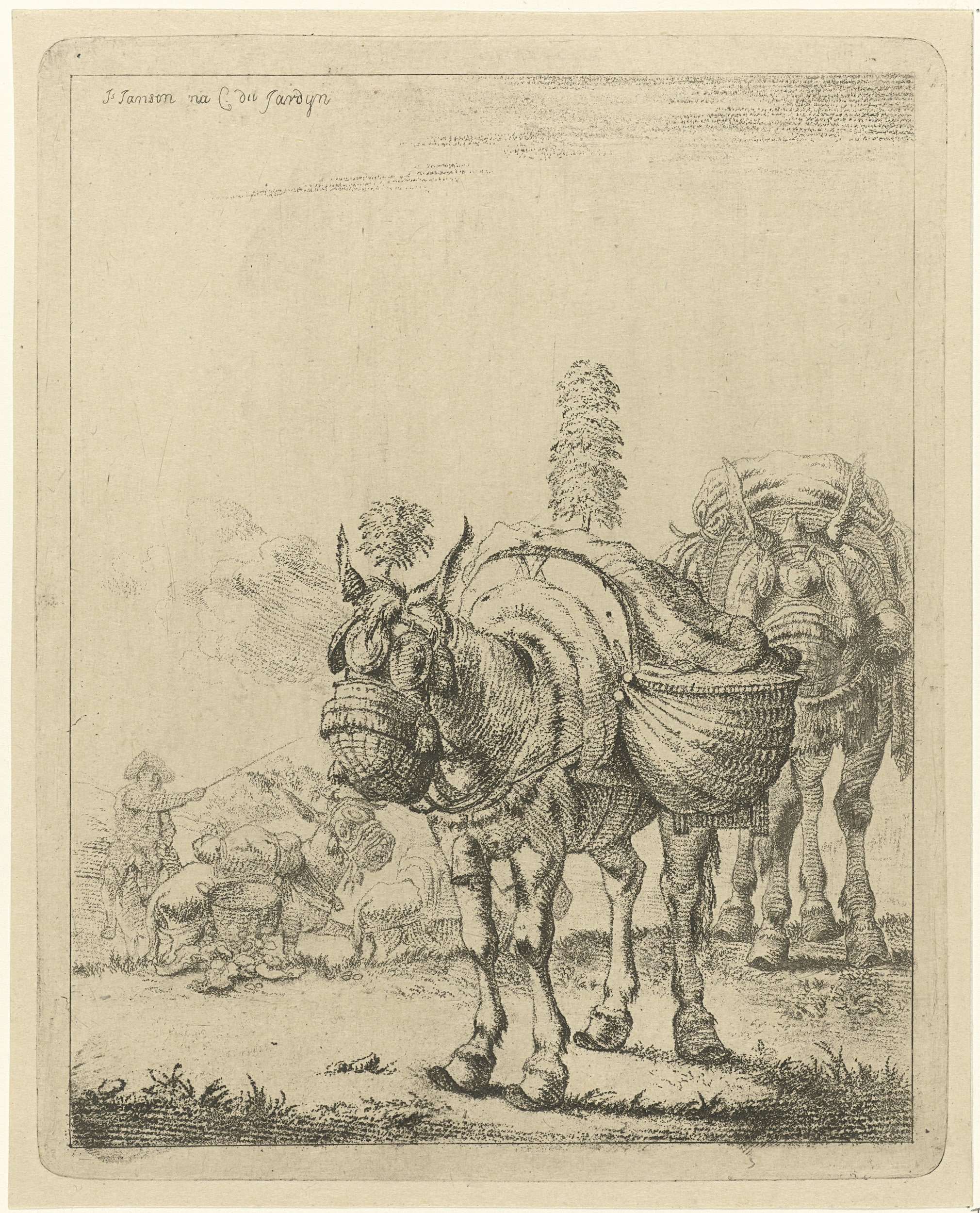 Twee bepakte muilezels, één met pluimen op kop en rug. Links op de achtergrond een ruiter die twee andere muildieren voortdrijft.