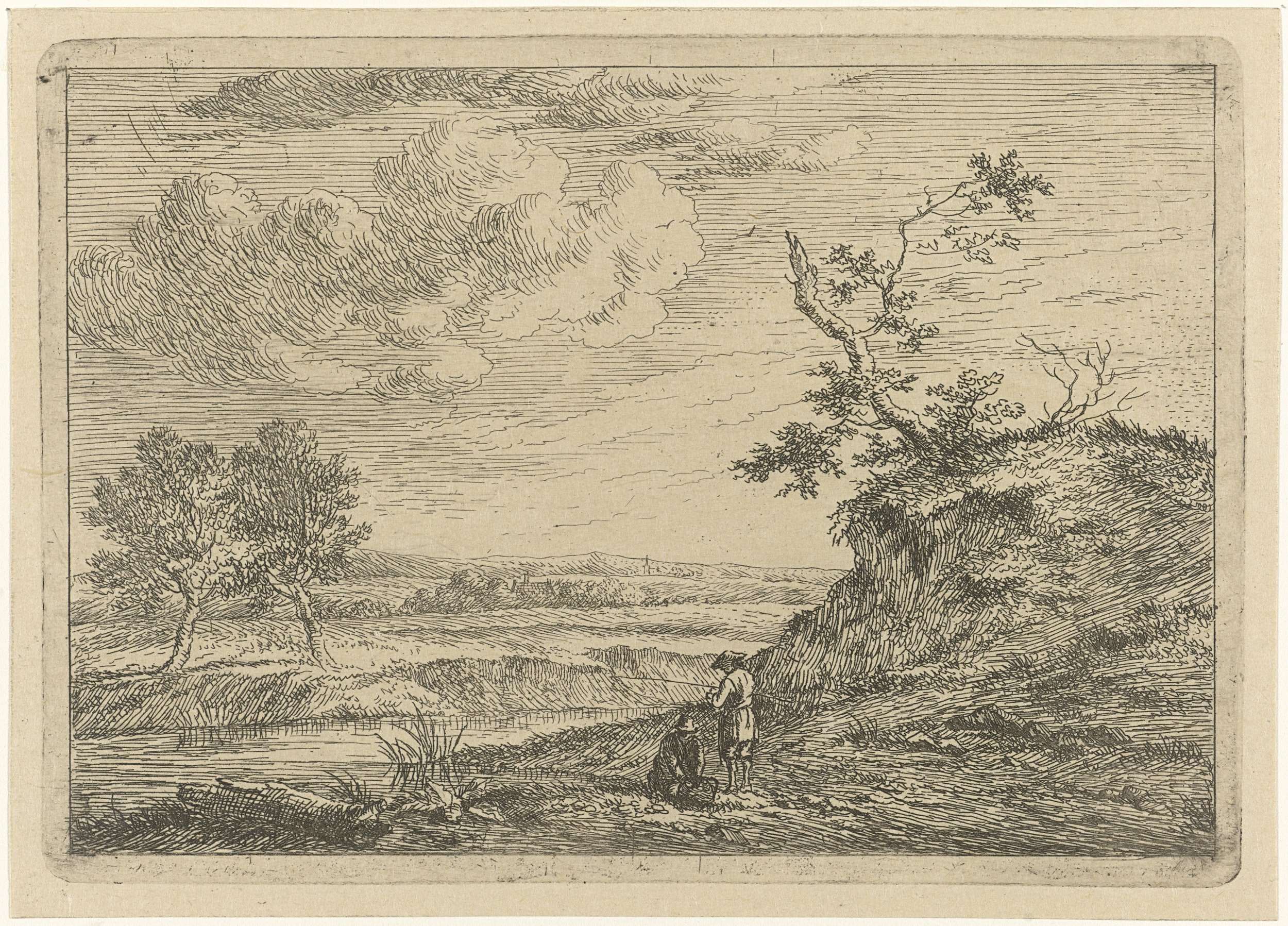 Landschap met twee vissers bij een rivier. Eén staand met een hengel, op de rug gezien. Prent uit een serie met landschappen.