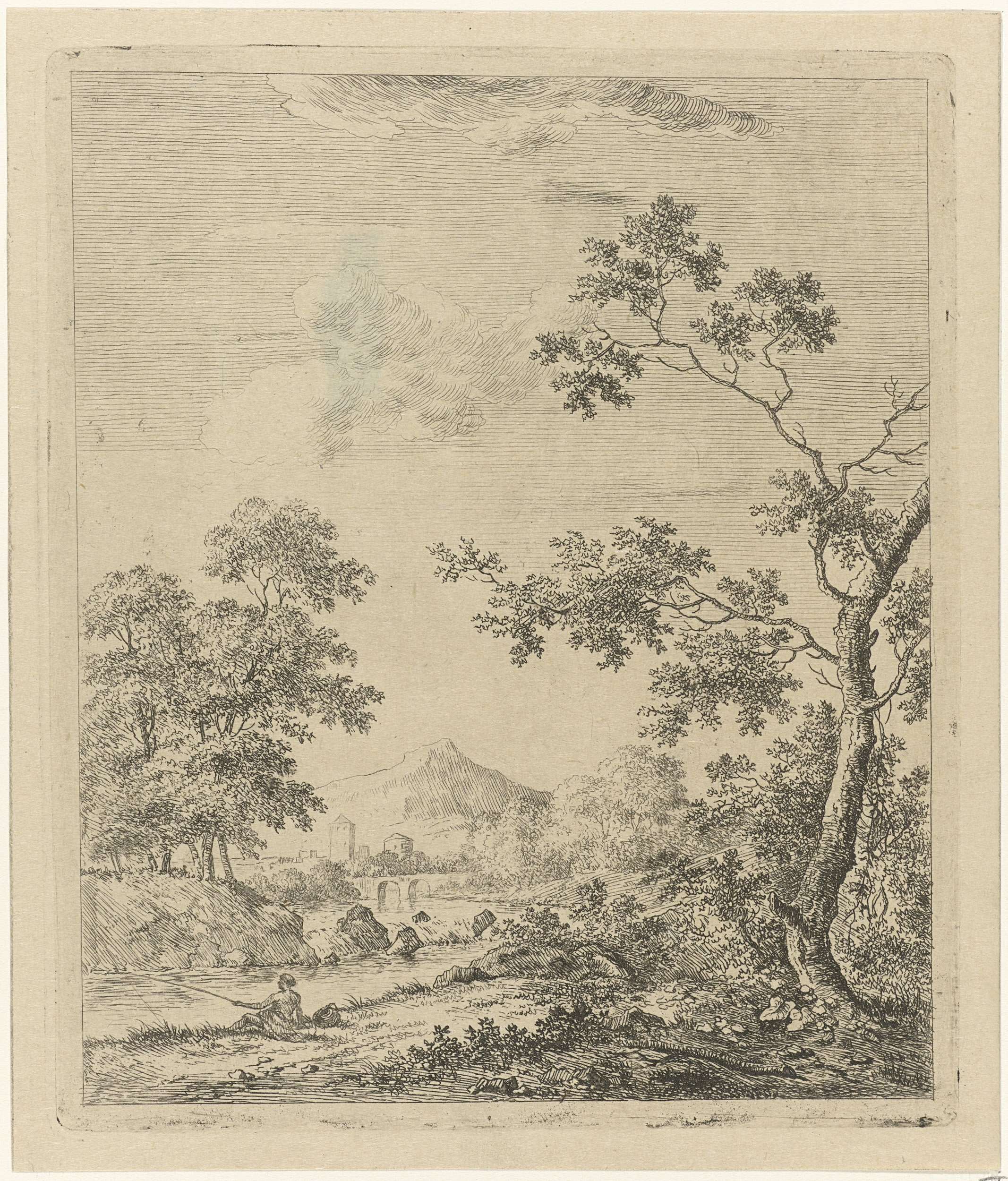 Heuvelachtig landschap met visser zittend bij een rivier. Prent uit een serie met landschappen.
