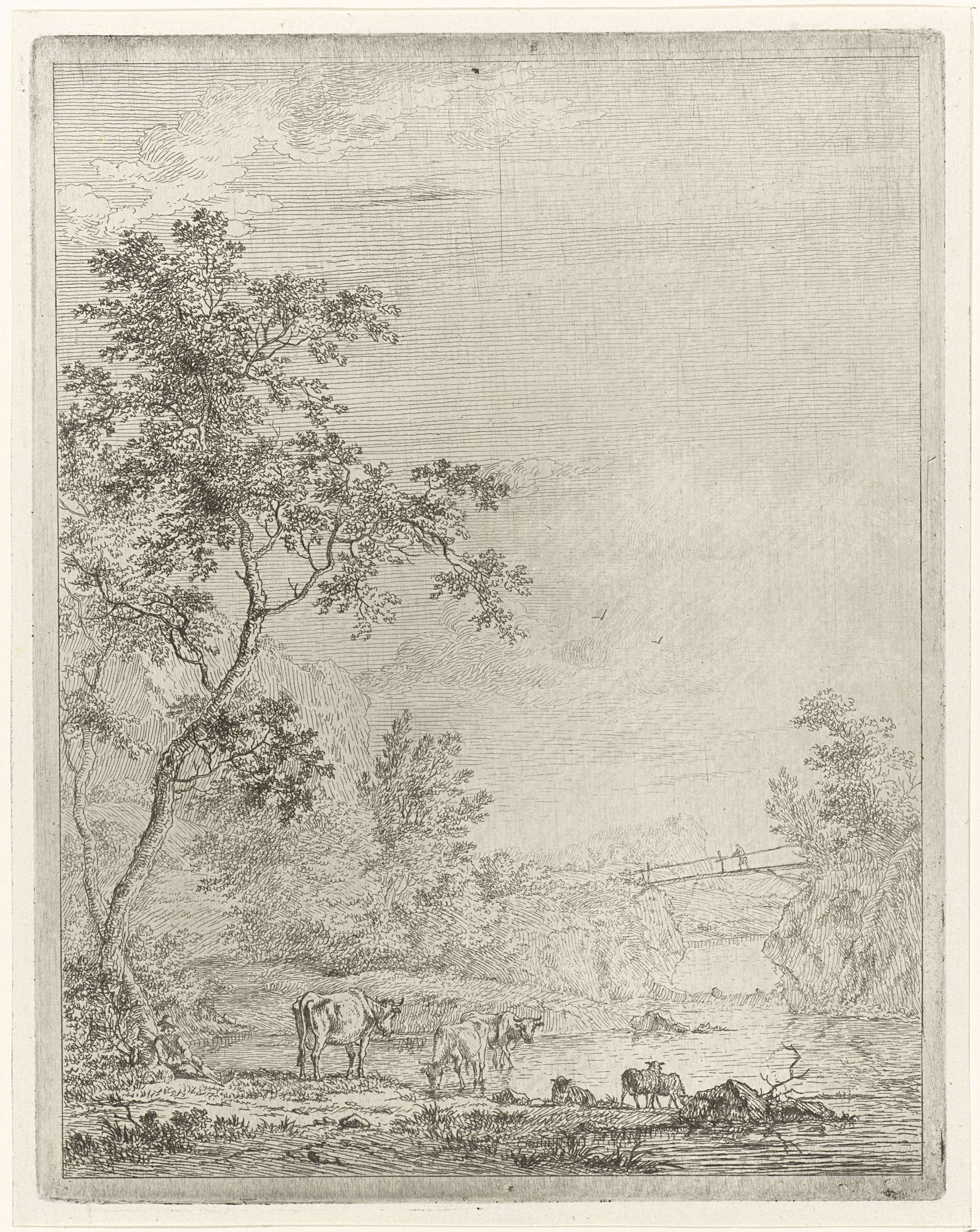 Bergachtig landschap met herder, zittend bij een boom, en koeien en schapen bij een rivier. Rechts op de achtergrond een brug met figuur erop. Prent uit een serie met landschappen met herders en vee.