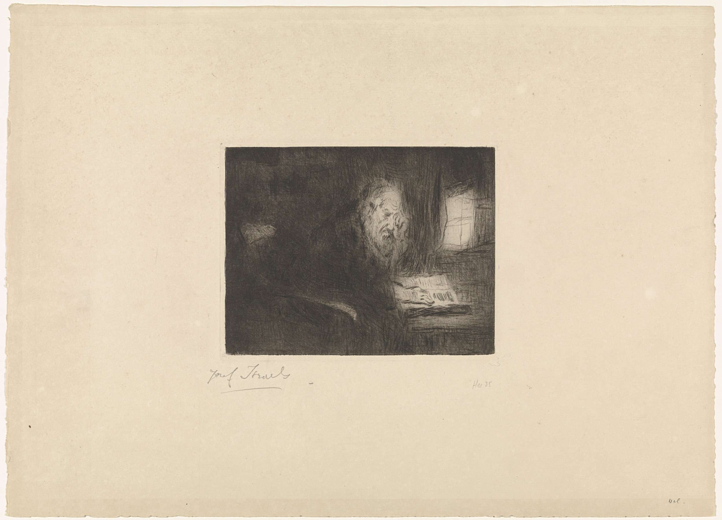 Donker vertrek met lezende oude man, zittend op een stoel aan een bureau bij een raam.