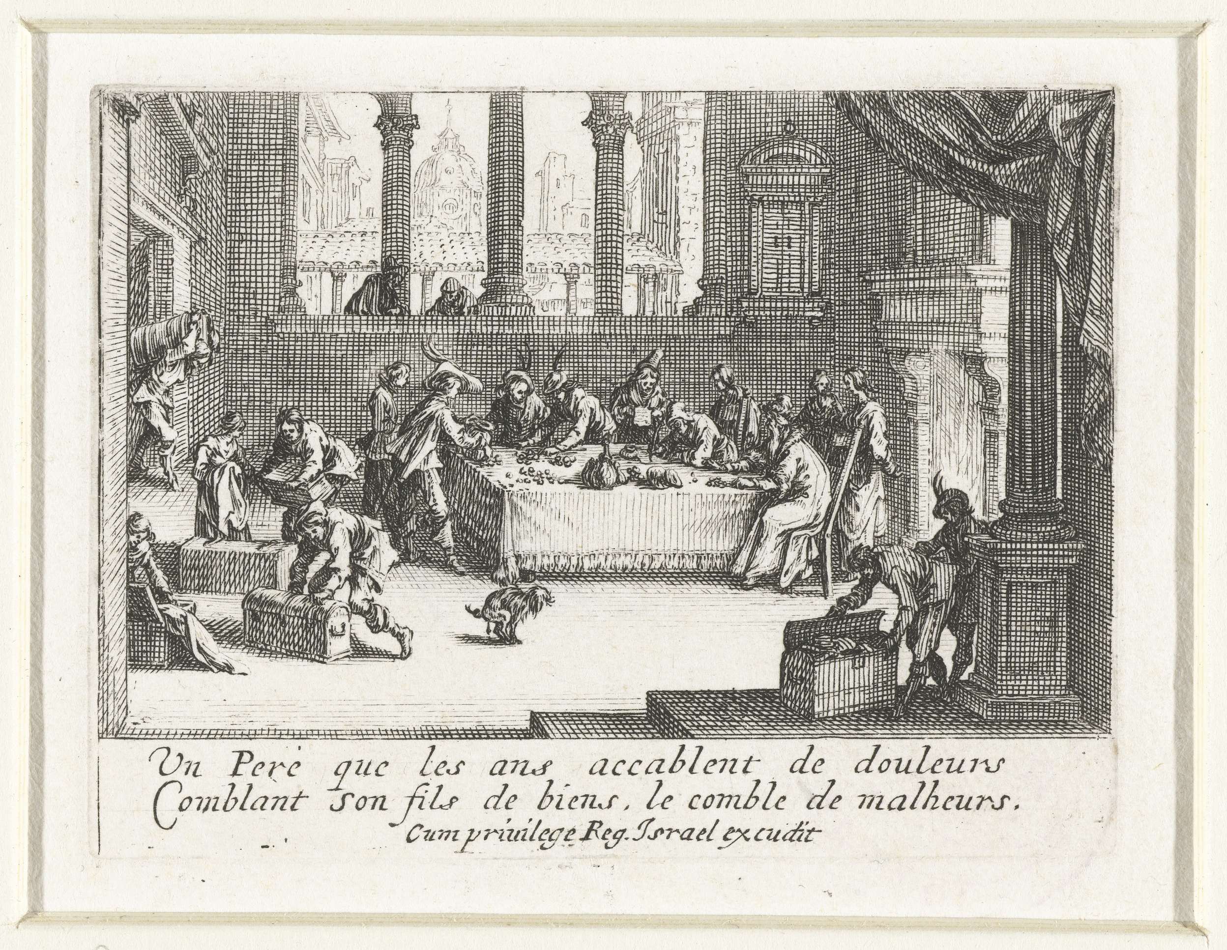 In een vertrek vol mensen zit een oudere man rechts aan tafel bij een aantal jongeren die munten onderling verdelen. Onder de voorstelling een tweeregelig Franstalig vers. Deze prent is onderdeel van een reeks prenten rond de gelijkenis van de verloren zoon, bestaande uit een titelprent en tien verhalende voorstellingen.