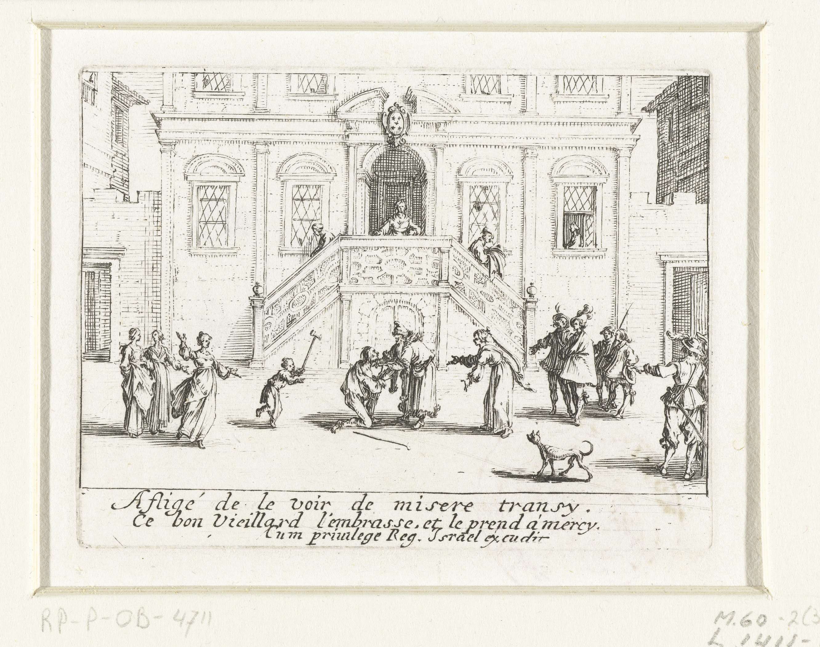 De verloren zoon is naar zijn ouderlijk huis teruggekeerd: hij wordt voor het bordes door zijn oude vader hartelijk begroet. Onder de voorstelling een tweeregelig Franstalig vers. Deze prent is onderdeel van een reeks prenten rond de gelijkenis van de verloren zoon, bestaande uit een titelprent en tien verhalende voorstellingen.