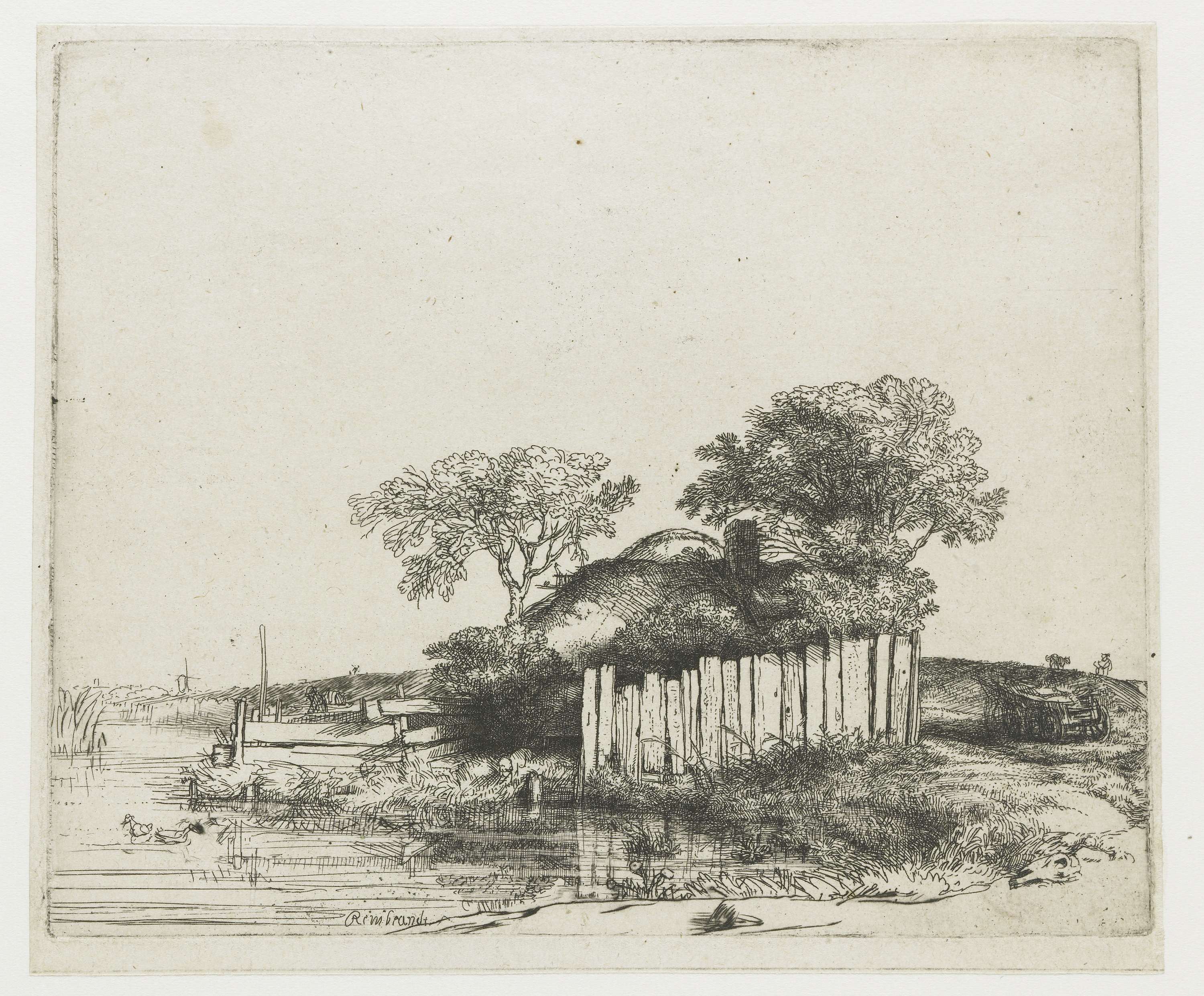 Op een van zijn wandelingen rond Amsterdam tekende Rembrandt dit huisje aan de Spaarndammerdijk. De tekening diende als startpunt voor de ets uit 1648. Er is een aantal verschillen tussen tekening en ets. De ets is veel kleiner, de bomen hebben een heel andere vorm, en Rembrandt voegde op de ets allerlei voorwerpen toe, zoals ...