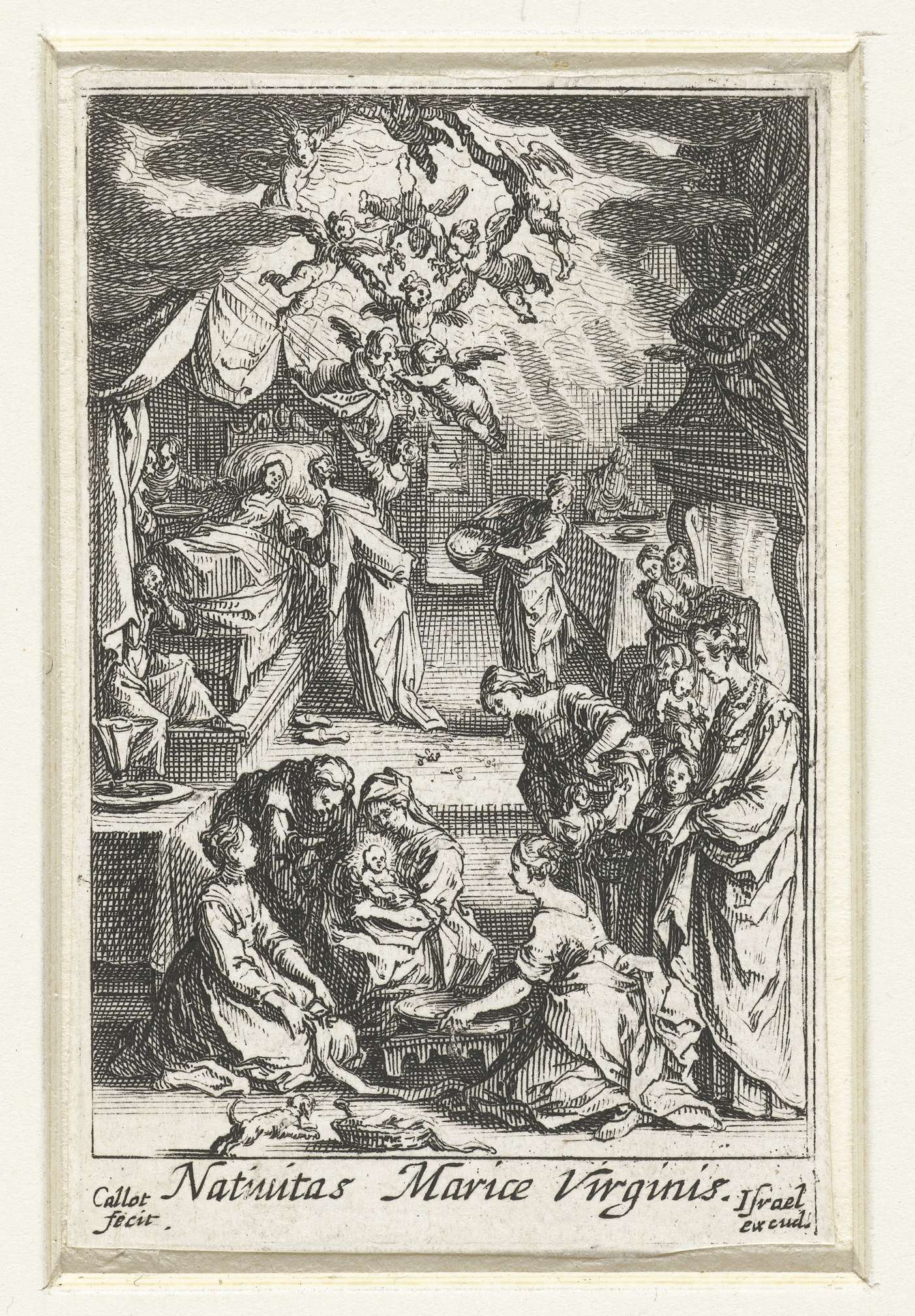 Een aantal vrouwen verzorgt de pasgeboren Maria, terwijl op de achtergrond engeltjes buitelen boven het bed van de zojuist bevallen Anna. Onder de voorstelling een onderschrift in Latijn. Deze prent is onderdeel van een reeks prenten rond het leven van Maria, bestaande uit een titelprent en dertien verhalende voorstellingen.