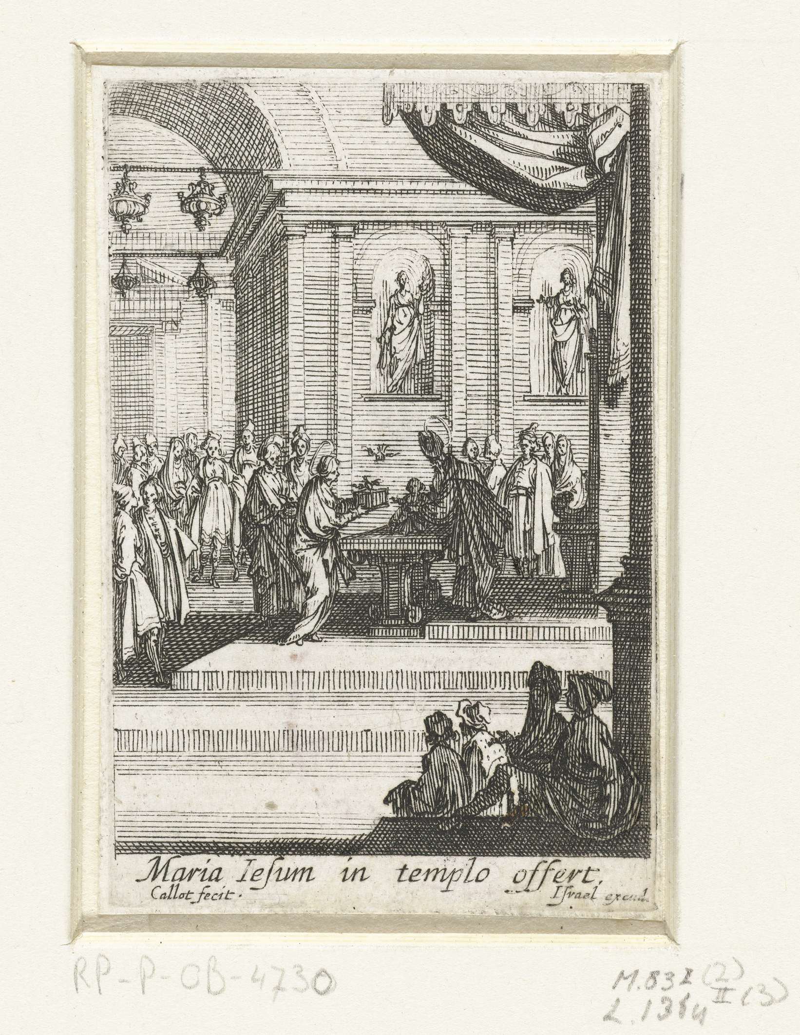 Maria biedt twee vogels aan aan de hogepriester die achter een altaar staat en het Christuskind vast heeft. Onder de voorstelling een onderschrift in Latijn. Deze prent is onderdeel van een reeks prenten rond het leven van Maria, bestaande uit een titelprent en dertien verhalende voorstellingen.