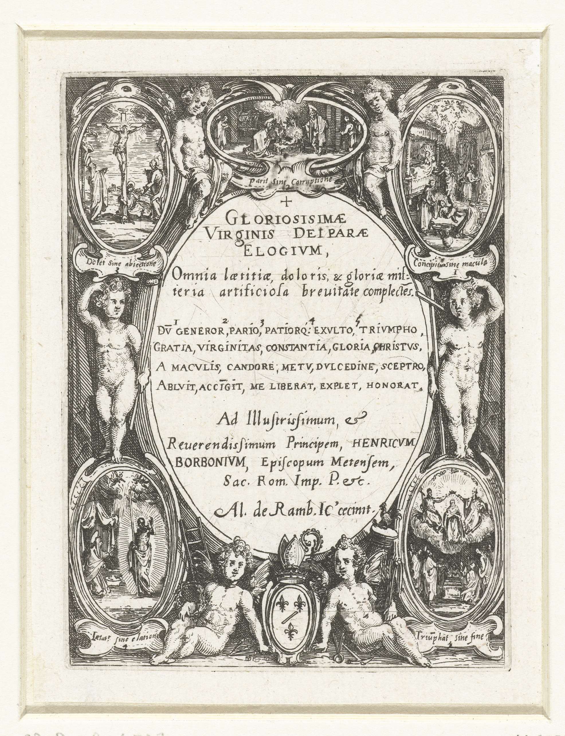 Cartouche met tekst omringd door putti en scènes uit het leven van Maria