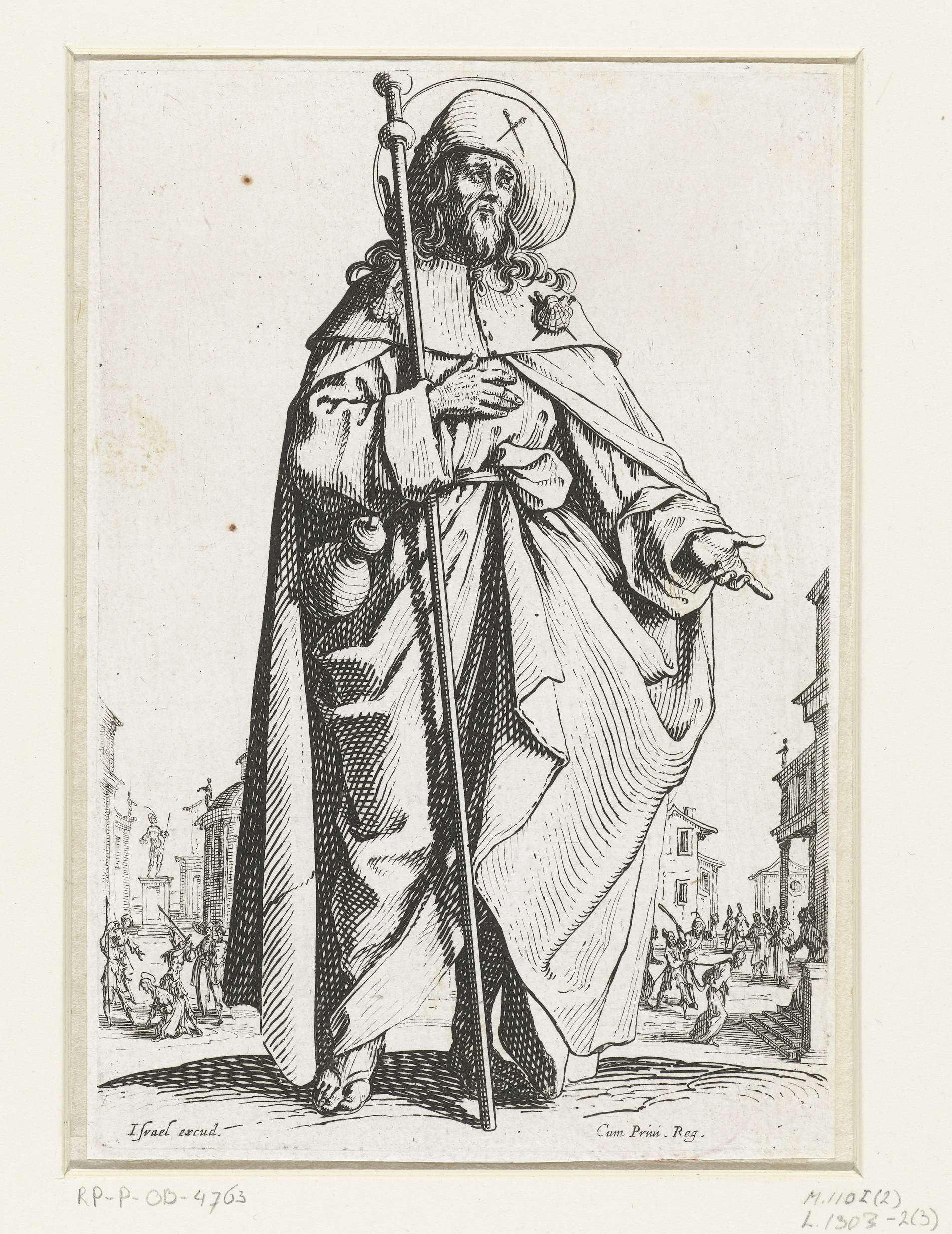 Jakobus de Meerdere, ten voeten uit, met de rechterarm een staf tegen zijn borst klemmend, een schelp op zijn mantel, een hoed op zijn hoofd. Op de achtergrond rechts is te zien hoe Jakobus geboeid voor Herodes wordt geleid; op de achtergrond links is te zien hoe hij wordt onthoofd. Deze prent is onderdeel van ...