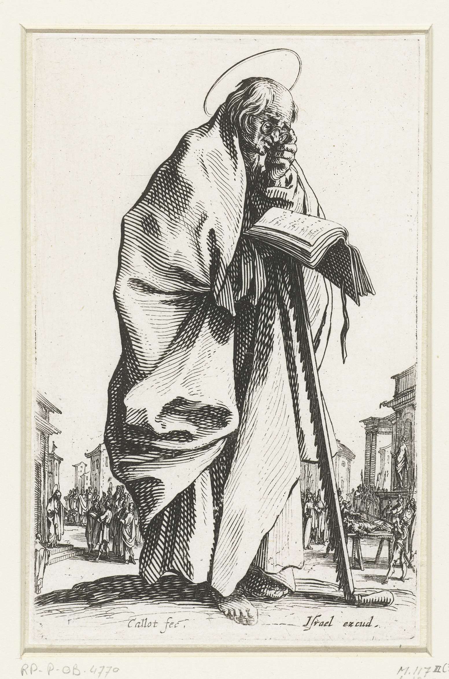 Simon, ten voeten uit, een zaag en een boek in de hand. Op de achtergrond links is te zien hoe hij preekt tot een menigte; op de achtergrond rechts is te zien hoe hij door midden wordt gezaagd. Deze prent is onderdeel van een reeks van 16 prenten, bestaande uit een titelblad en 15 portretten, ...