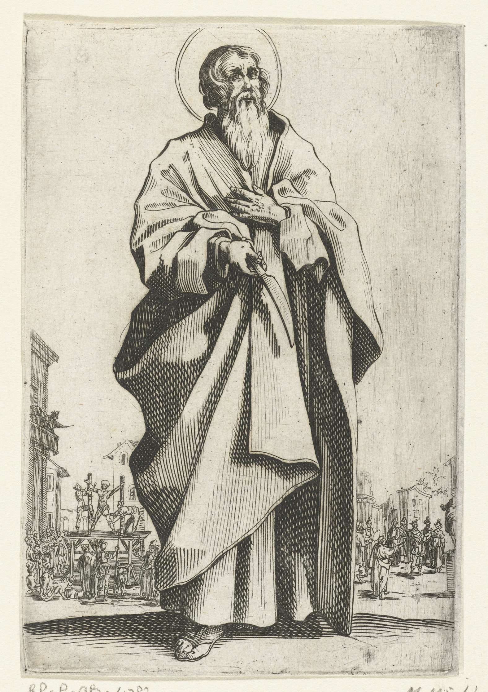 Bartholomeüs, ten voeten uit, een mes in de hand. Op de achtergrond rechts is te zien hoe hij boze geesten uitdrijft; op de achtergrond links is te zien hoe hij wordt gevild. Deze prent is onderdeel van een reeks van (waarschijnlijk) 16 prenten, bestaande uit een titelblad en (waarschijnlijk) 15 portretten, voorstellende Christus, Maria en ...