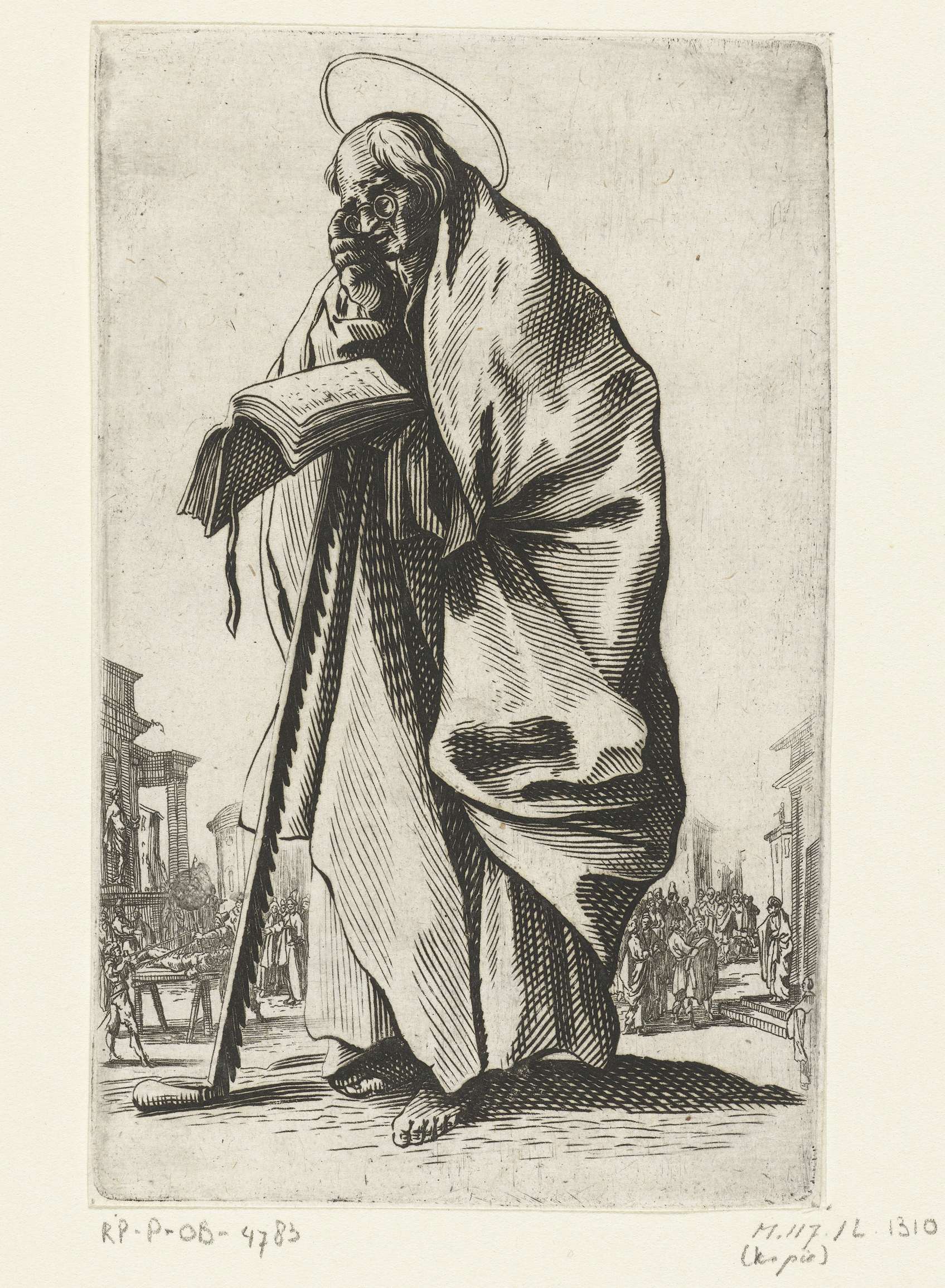 Simon, ten voeten uit, een zaag en een boek in de hand. Op de achtergrond rechts is te zien hoe hij preekt tot een menigte; op de achtergrond links is te zien hoe hij door midden wordt gezaagd. Deze prent is onderdeel van een reeks van (waarschijnlijk) 16 prenten, bestaande uit een titelblad en (waarschijnlijk) ...