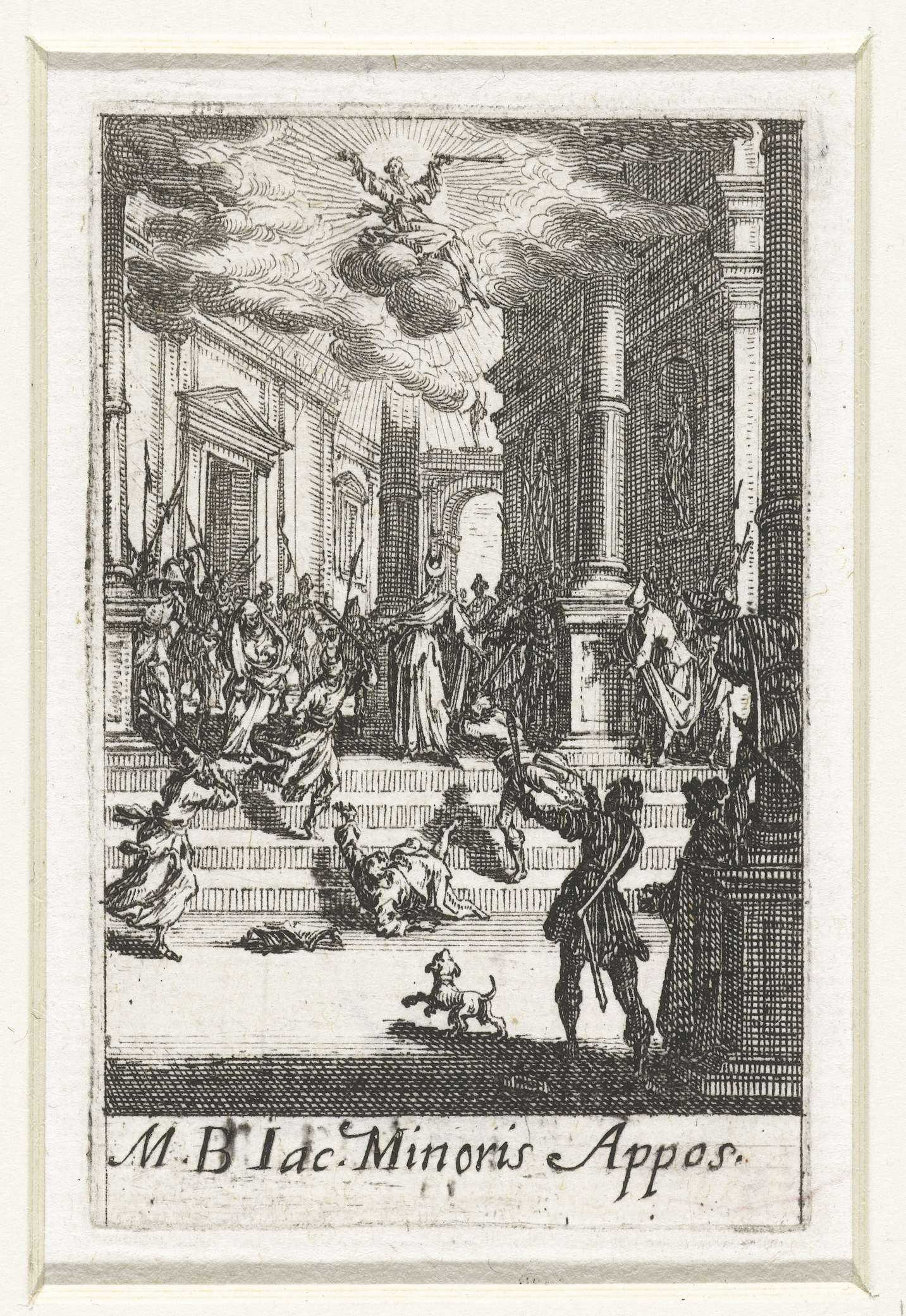 Jakobus de Mindere wordt door mannen met knuppels doodgeslagen. Boven deze scène is Jakobus de Mindere nogmaals afgebeeld, op een wolk in de hemel, een knuppel in de hand. Onder de voorstelling een onderschrift in Latijn. Deze prent is onderdeel van een reeks van 16 prenten, bestaande uit een titelblad en 15 voorstellingen van de ...