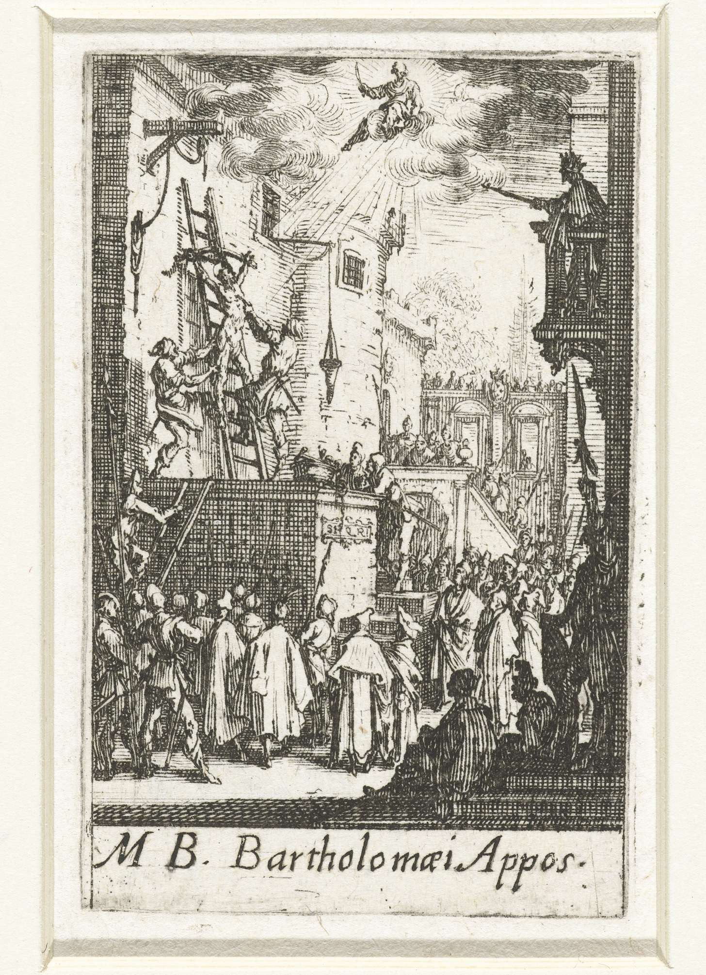 Bartholomeüs wordt, gebonden aan een ladder, gevild op een podium voor een groep toeschouwers. Boven deze scène is Bartholomeüs nogmaals afgebeeld, op een wolk in de hemel, een mes in de hand. Onder de voorstelling een onderschrift in Latijn. Deze prent is onderdeel van een reeks van 16 prenten, bestaande uit een titelblad en 15 ...