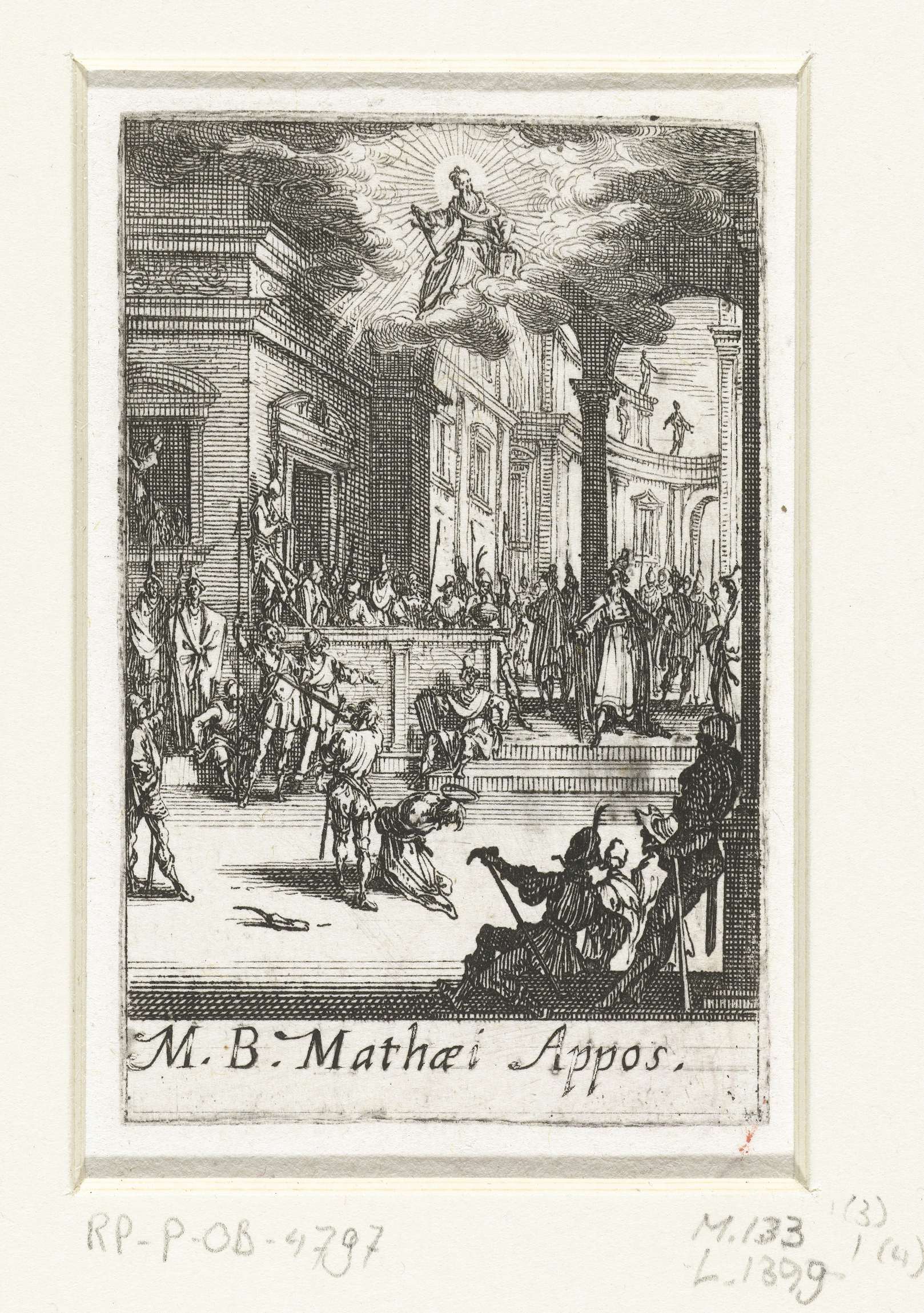 Mattheüs wordt met een zwaard onthoofd in het bijzijn van vele toeschouwers. Boven deze scène is Mattheüs nogmaals afgebeeld, op een wolk in de hemel, een zwaard in de hand. Onder de voorstelling een onderschrift in Latijn. Deze prent is onderdeel van een reeks van 16 prenten, bestaande uit een titelblad en 15 voorstellingen van ...