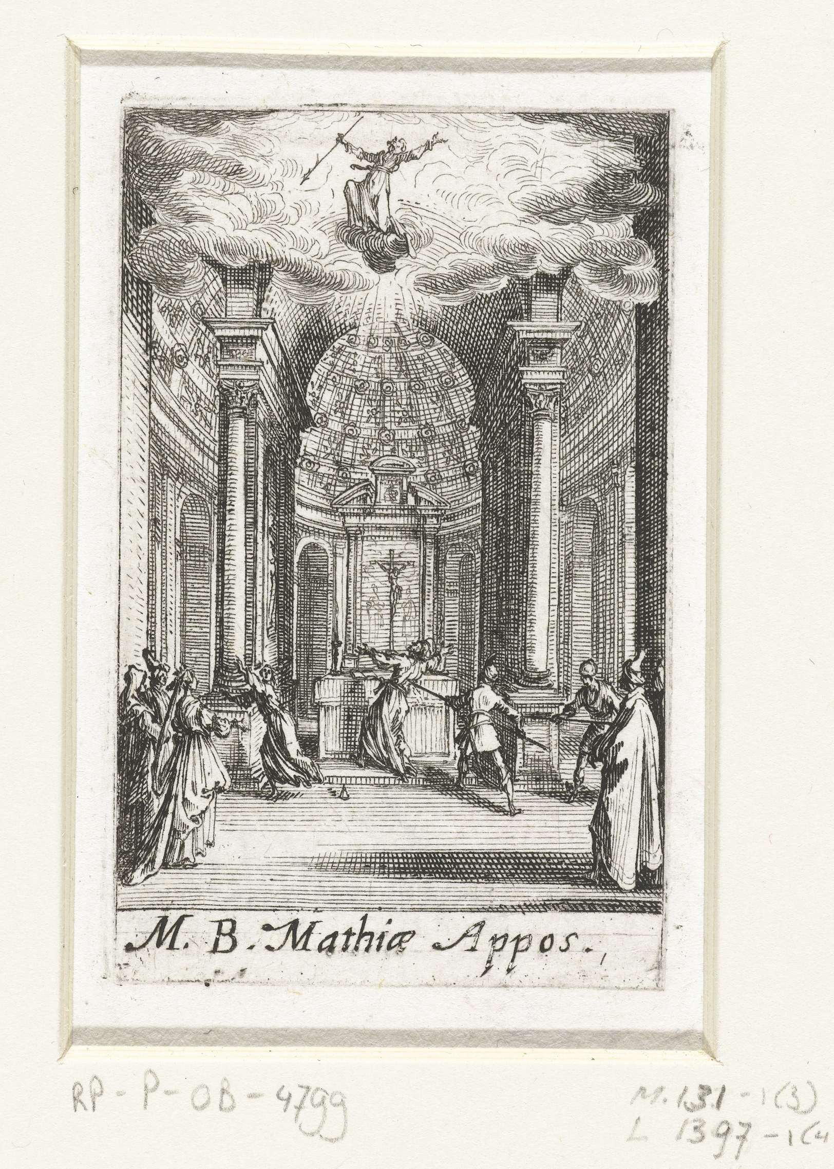 Matthias wordt voor een altaar doodgestoken door een man met een speer. Boven deze scène is Matthias nogmaals afgebeeld, op een wolk in de hemel, een speer in de hand. Onder de voorstelling een onderschrift in Latijn. Deze prent is onderdeel van een reeks van 16 prenten, bestaande uit een titelblad en 15 voorstellingen van ...