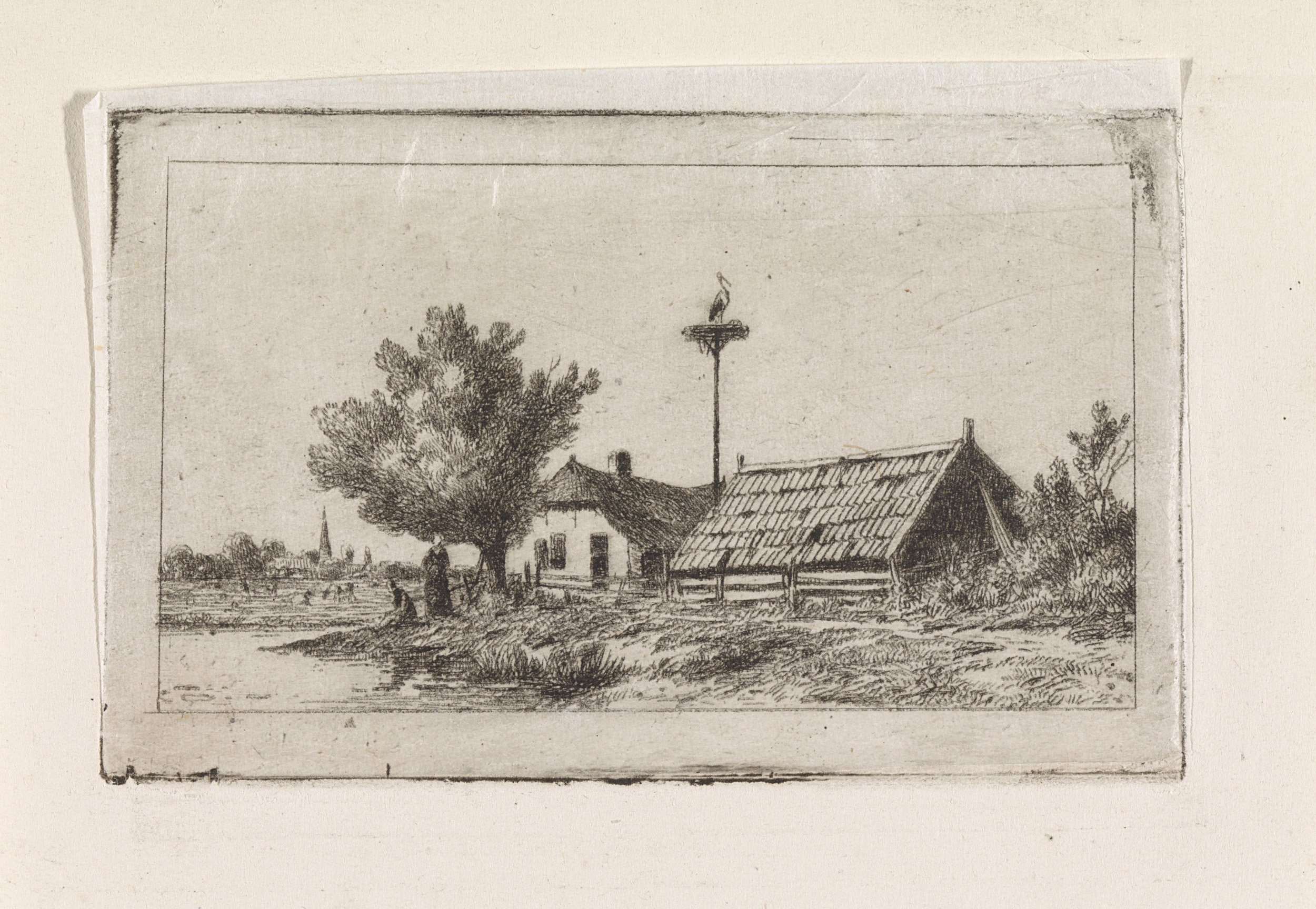 Een ooievaarsnest tussen een schuur en een woning aan een waterkant. Links op de voorgrond een man en een vrouw onder een boom.