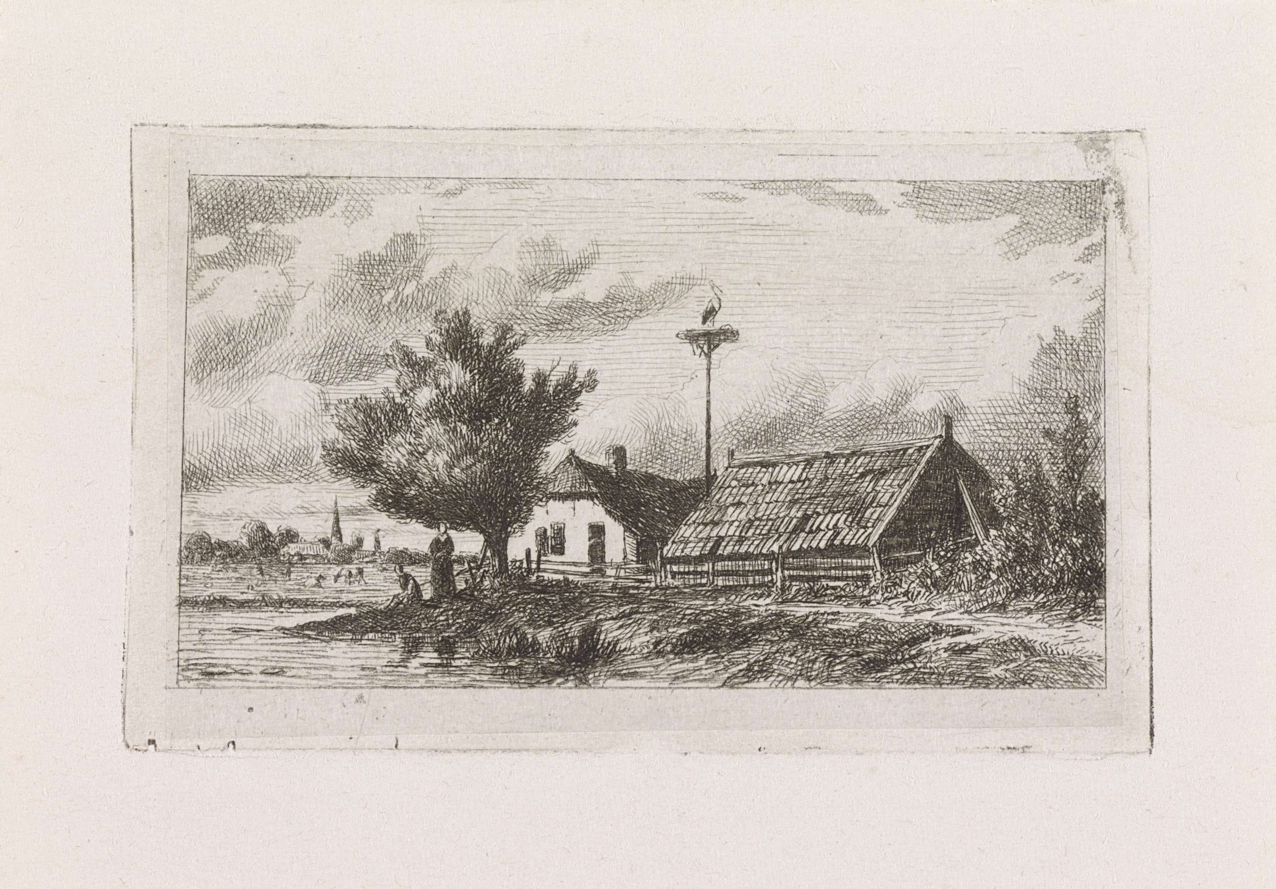 Een ooievaarsnest tussen een schuur en een woning aan een waterkant. Links op de voorgrond een man en een vrouw onder een boom.