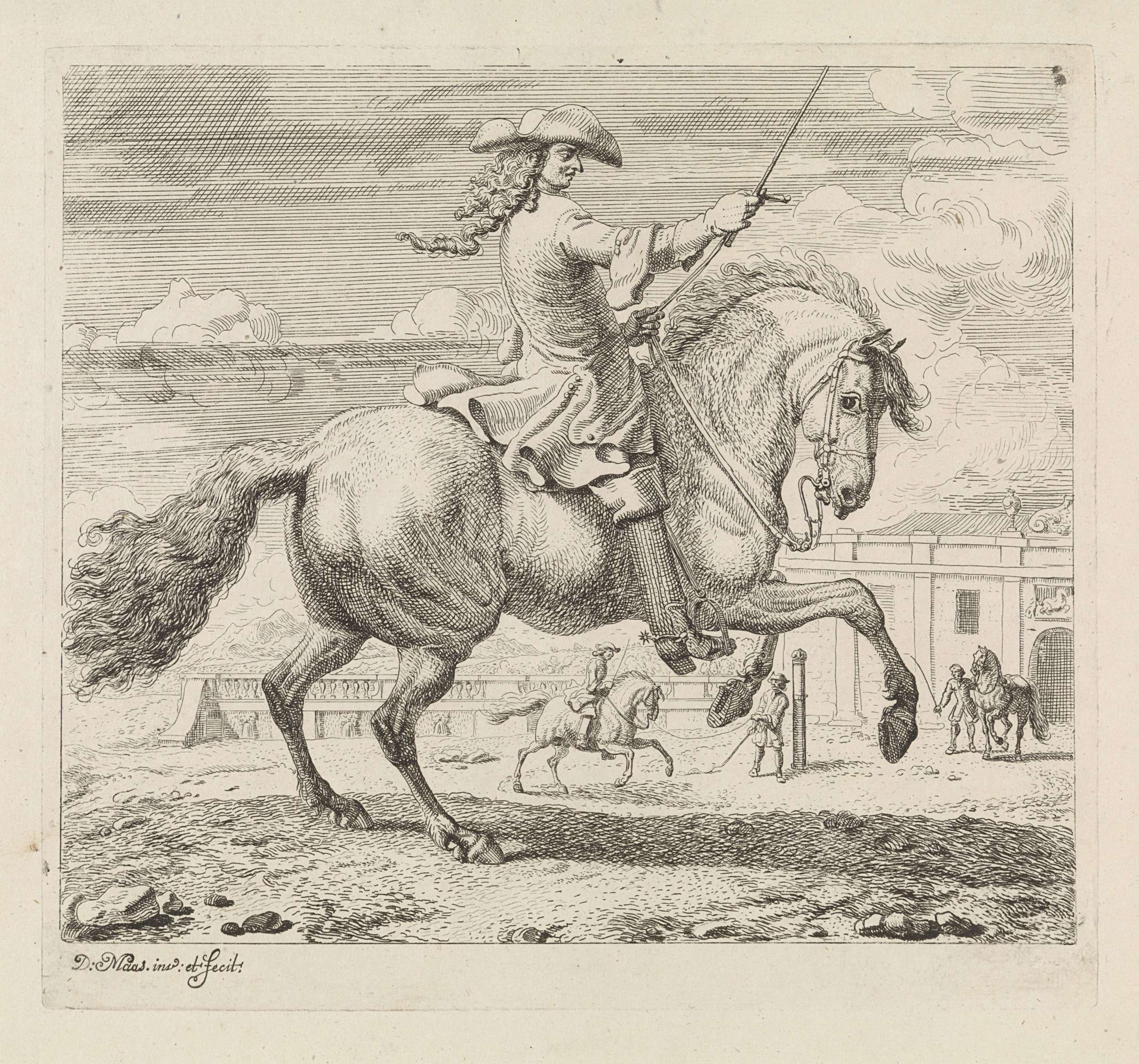 Ruiter naar rechts. Op de achtergrond een manege, waar een man naast een paard loopt. Tevens een paard met ruiter aan een longeerlijn. Prent uit een serie van negen prenten met onderwerp de manege.