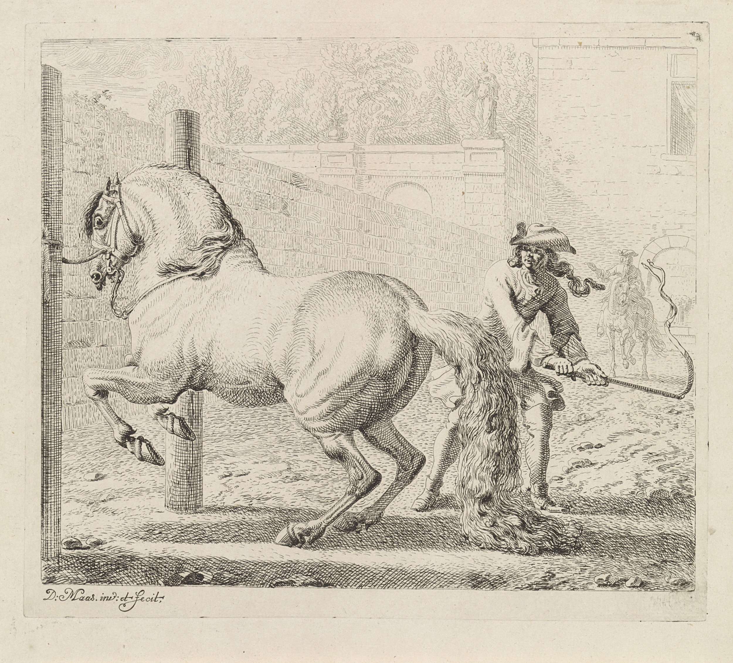 Man met een zweep bij een paard dat is vastgebonden aan een paal, op een binnenplaats. Prent uit een serie van negen prenten met onderwerp de manege.