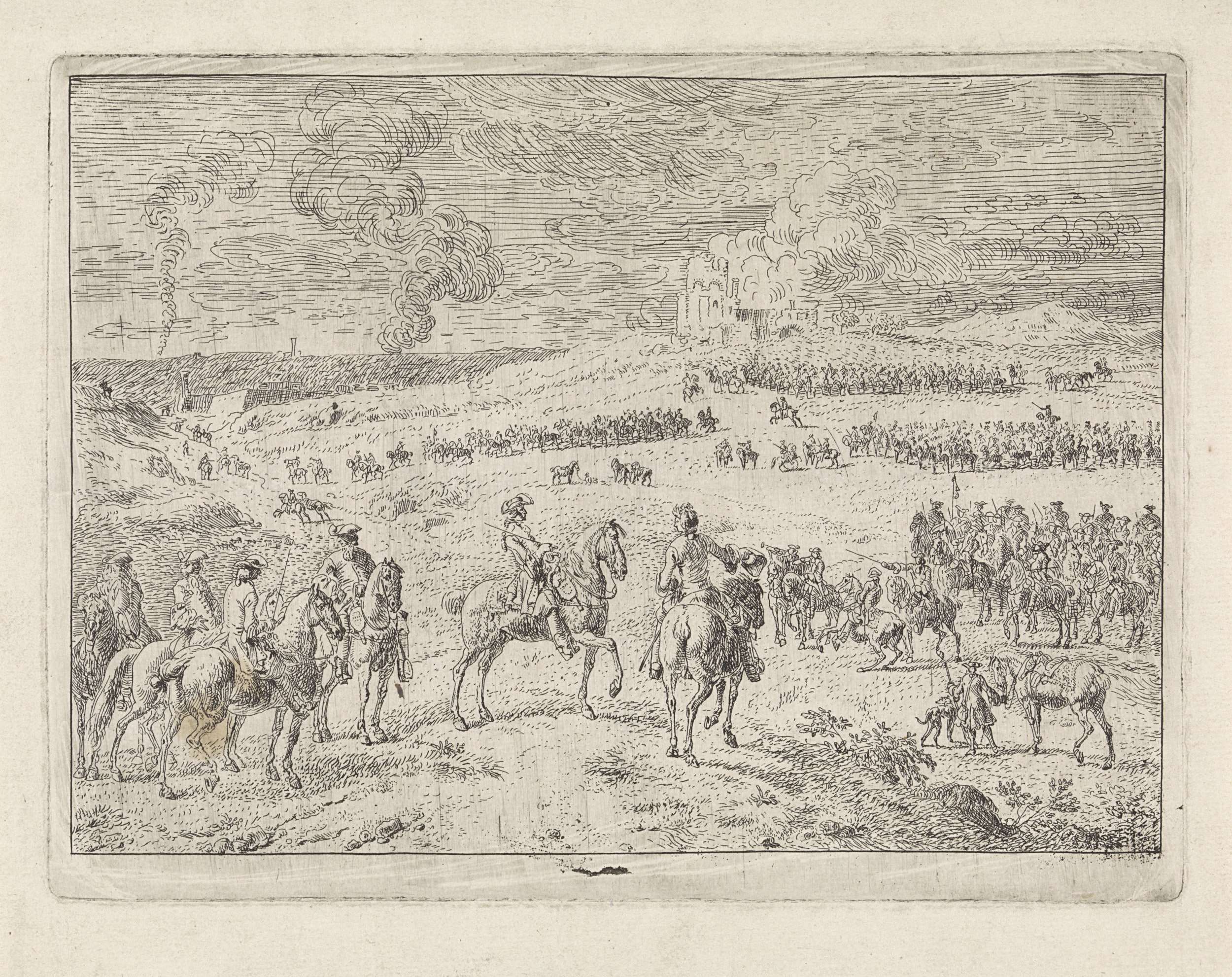 Gezicht op de slag aan de Boyne, met op de voorgrond Willem III, te paard. Op het slagveld vele ruiters en op de achtergrond een brandende ruïne.